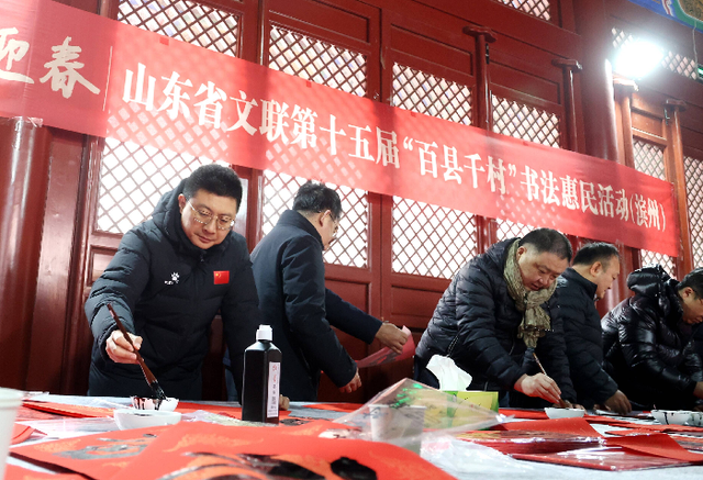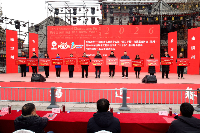 迎春的无棣古城,欢声笑语、喜气洋洋。1月28日上午,万福迎春——山东省文联第十五届“百县千村”书法惠民活动(滨州)暨2026年滨州市文化科技卫生“三下乡”集中服务活动、“黄河大集”新春季启动仪式,在无棣古城县衙广场举行。市委常委、宣传部部长冷兴邦出席活动并讲话。
