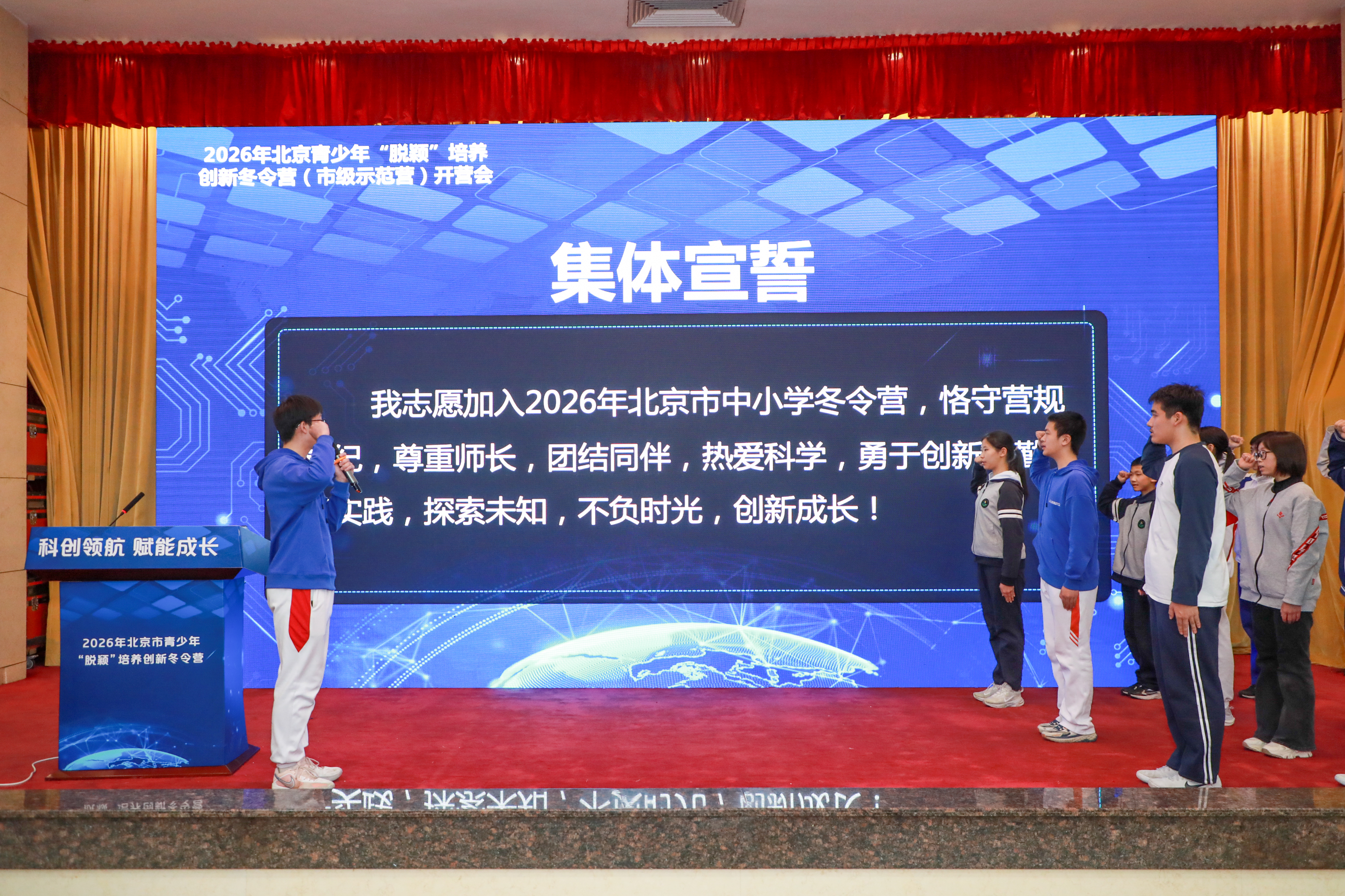 现场,全体营员庄严宣誓:将恪守营规营纪,尊重师长,团结同伴,热爱科学,勇于创新,勤于实践,探索未知,不负时光,创新成长。