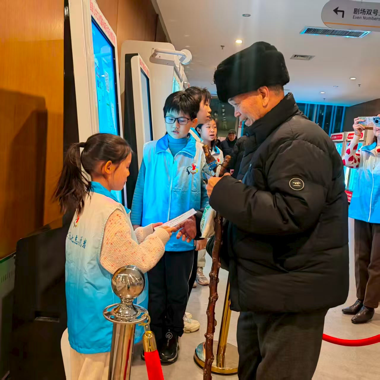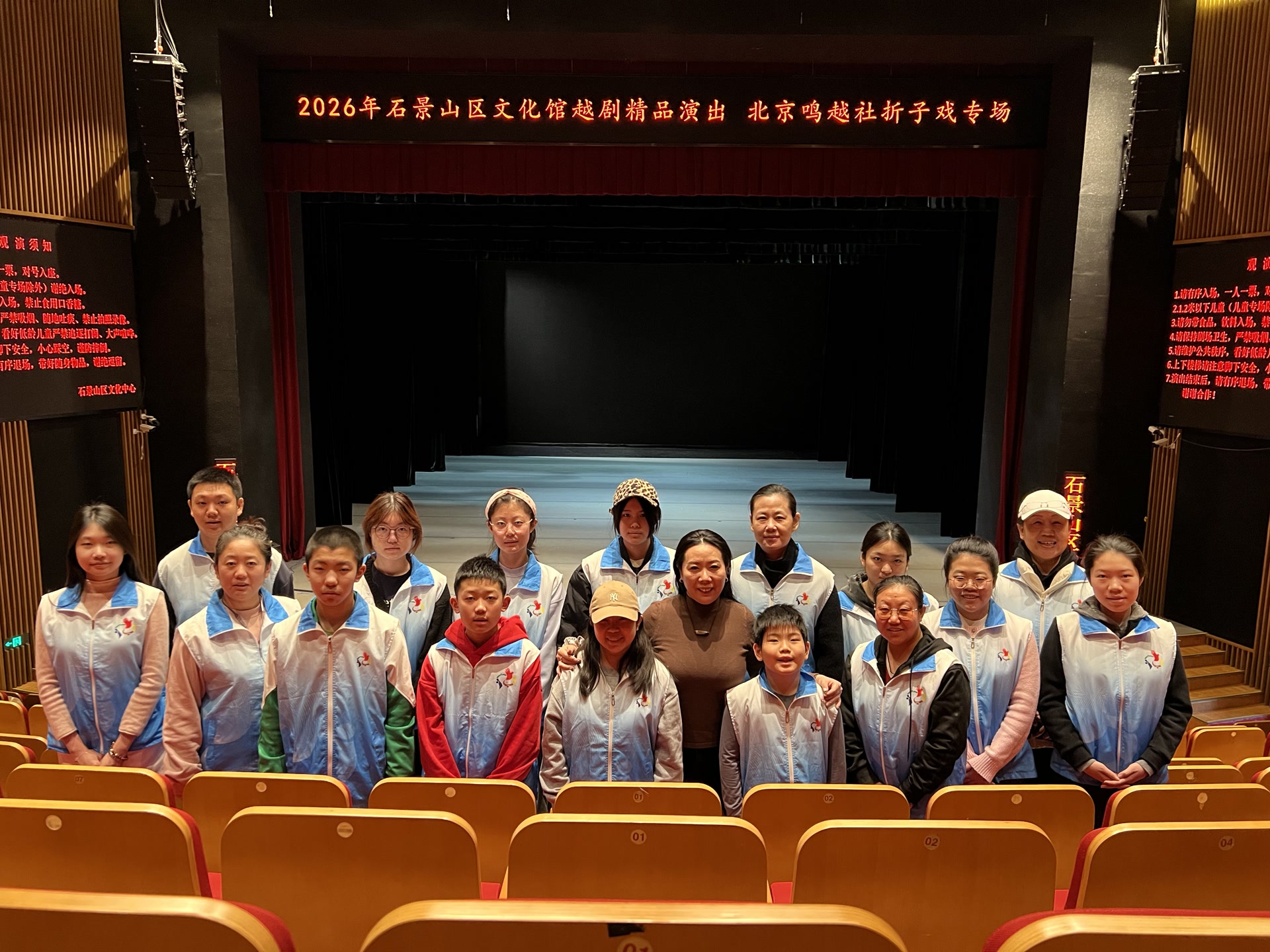 今天是2026年石景山区文化馆越剧精品“北京鸣越社折子戏专场”演出,小小志愿者们提前一个小时到岗,来到石景山区文化中心小剧场,协助老年观众从出票机出票,引导观众、特别是老年观众入场。