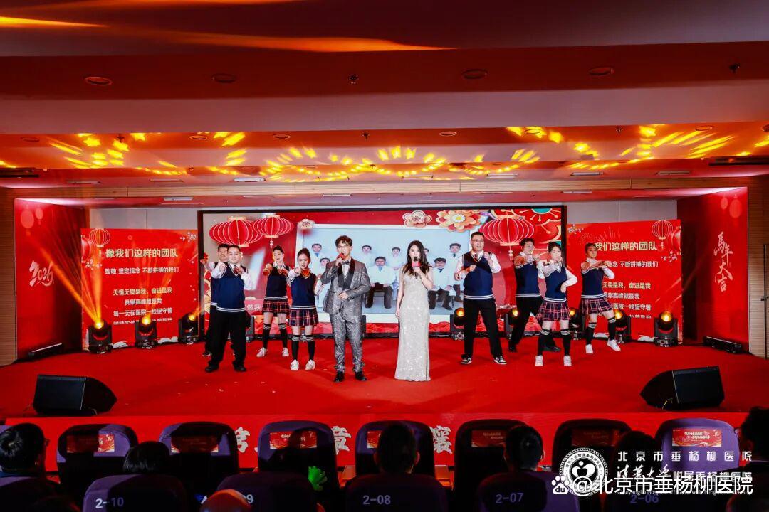 律回岁晚,春满医苑。2026年1月30日下午13:30,医院在门诊五层学术报告厅举办“骏马迎春展宏图,垂柳医韵谱华章”2026年新春职工文艺汇演。朝阳区卫生健康委员会副主任周世凯、朝阳区纪委区监委驻区卫健委纪检监察组组长王聪慧、朝阳区医疗卫生工会主席刘政华、朝阳区卫健委医政医管一科科长任涛、朝阳区人力资源和社会保障局副局长郑国权、劲松街道党工委副书记、办事处副主任蔡旭、双井街道办事处副主任王恺、双井街道办事处民生办主任李化、双井派出所所长马将、劲松派出所所长步海超、潘家园派出所政委施宇、医院老领导何兴图、王永光、夏文斌;医院特聘专家张杰主任、戴荣平主任、肖新华主任,和医院领导班子、全体中层干部(正副职)、科室代表以及退休职工代表欢聚一堂,共迎丙午马年新春。