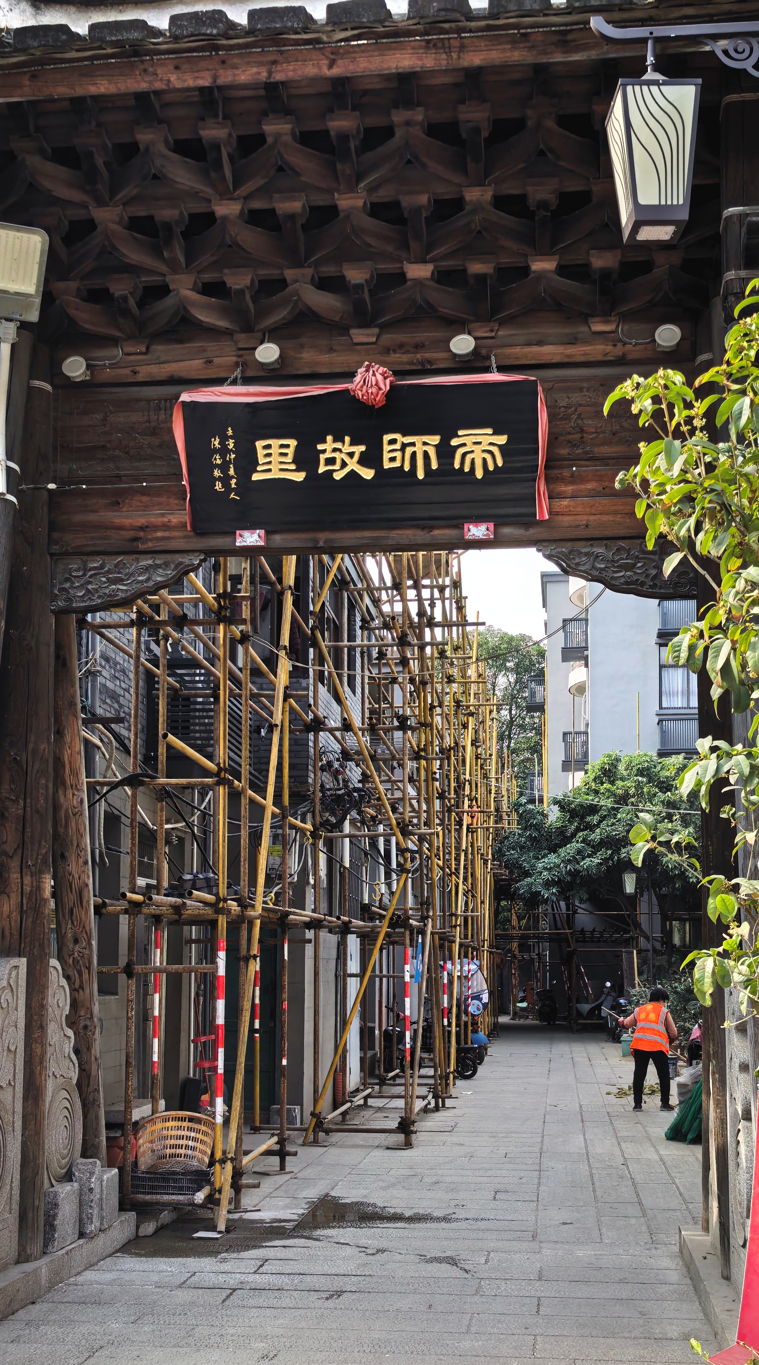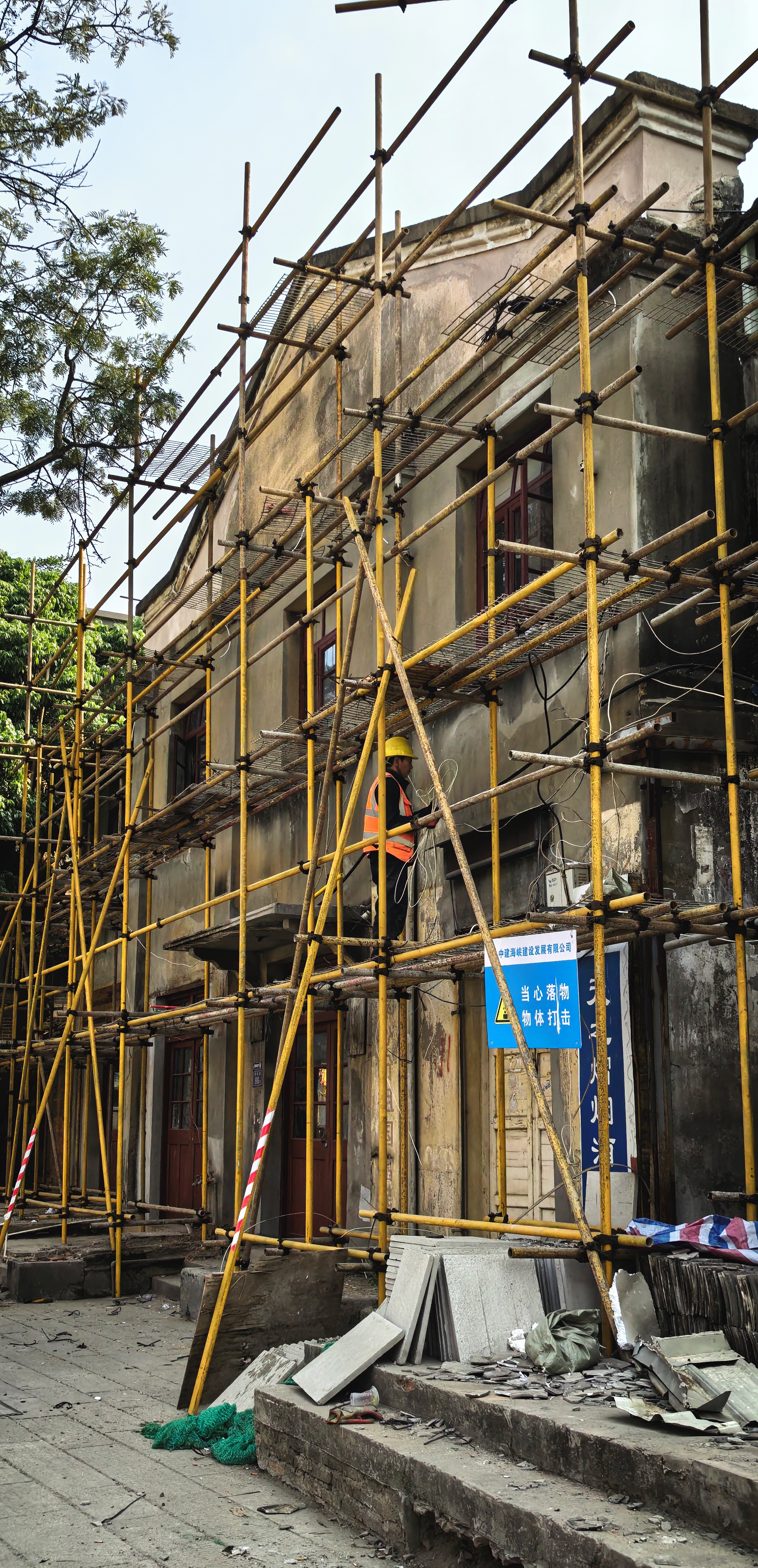 走进螺洲古镇便被眼前满镇子的脚手架所震撼,几乎所有的主街建筑都被脚手架笼罩,机械的轰鸣声,与穿梭于此的施工车辆让我仿佛回到了北京奥运会时沸腾的工地。