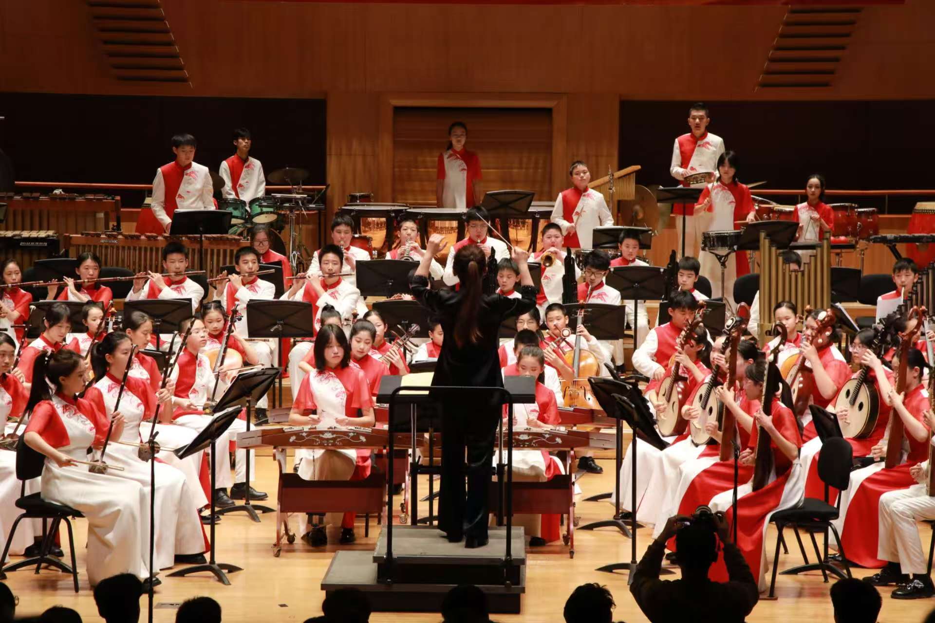 演出在《黑走马》昂扬的旋律中拉开序幕。舞台上,来自丰台区少年宫民族管弦乐团、北京市第十五中学金帆民族管弦乐团、金融街少年宫金声国乐团等不同团体的青少年乐手汇聚一堂。他们神情专注、默契配合,从《小河淌水》的温婉细腻,到《草原上升起不落的太阳》的辽阔深情,一首首精心编排的曲目,既展现了民族音乐的深厚底蕴,也传递出孩子们在美育浸润中积淀的艺术素养与精神风貌。教师乐团与学生乐团依次登台,声部层次分明,情感层层递进,直观呈现了“教”与“学”之间技艺与精神的传承。