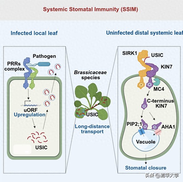 研究团队进一步研究了“系统性气孔免疫”的分子基础,发现一个由上游开放阅读框(uORF)编码的小肽是介导“系统性气孔免疫”的关键移动性信号分子,命名为USIC。本地叶片受到侵染后,USIC迅速合成,包裹于囊泡中通过维管组织传递至远端未被侵染的系统叶片。在系统叶片中,USIC被保卫细胞表面的受体复合体SIRK1-KIN7识别,激活钙离子内流。这一信号触发半胱氨酸蛋白酶MC4对共受体KIN7进行剪切,释放KIN7胞内结构域,使其从质膜转移至液泡膜。KIN7胞内结构域与AHA1质子泵及PIP2;1水通道蛋白在液泡膜上相互作用,使液泡失水,驱动气孔快速关闭(图1)。令人振奋的是,USIC有效诱导白菜、甘蓝、萝卜、番茄等植物的气孔关闭,展现出良好的农业应用前景。