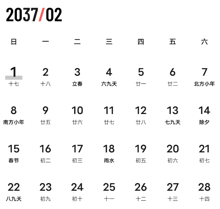 当然,如果一定要给2026年的2月找个特殊的地方出来,还真有一个。那就是2月1日恰好是周日,如果按照“周日、周一……一直到周六”的顺序排列,整个2月的日历呈现恰好方方正正。但这样的排列规律真的是823年才出现一次吗?