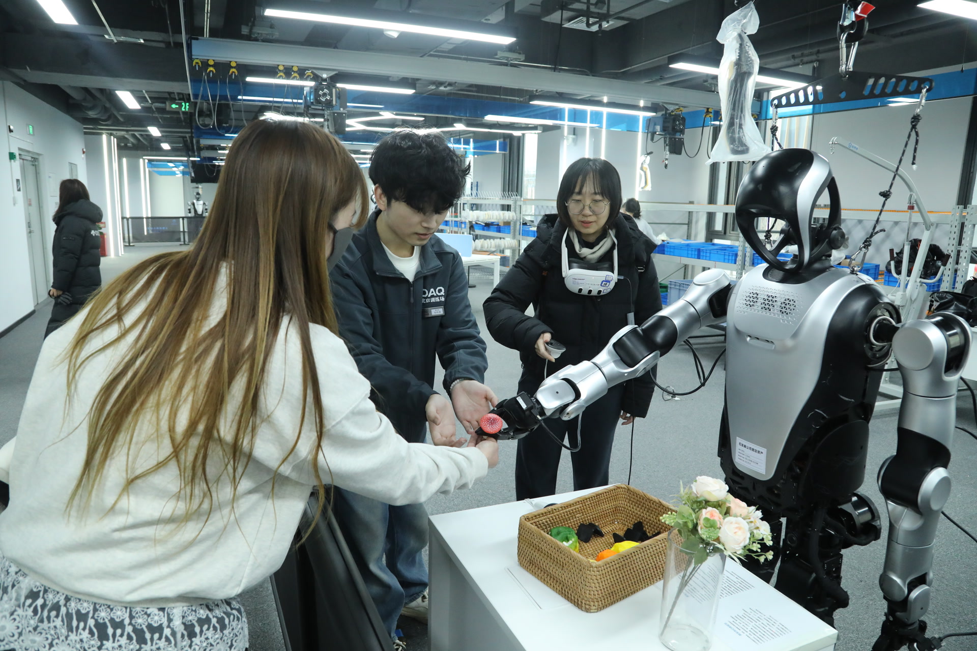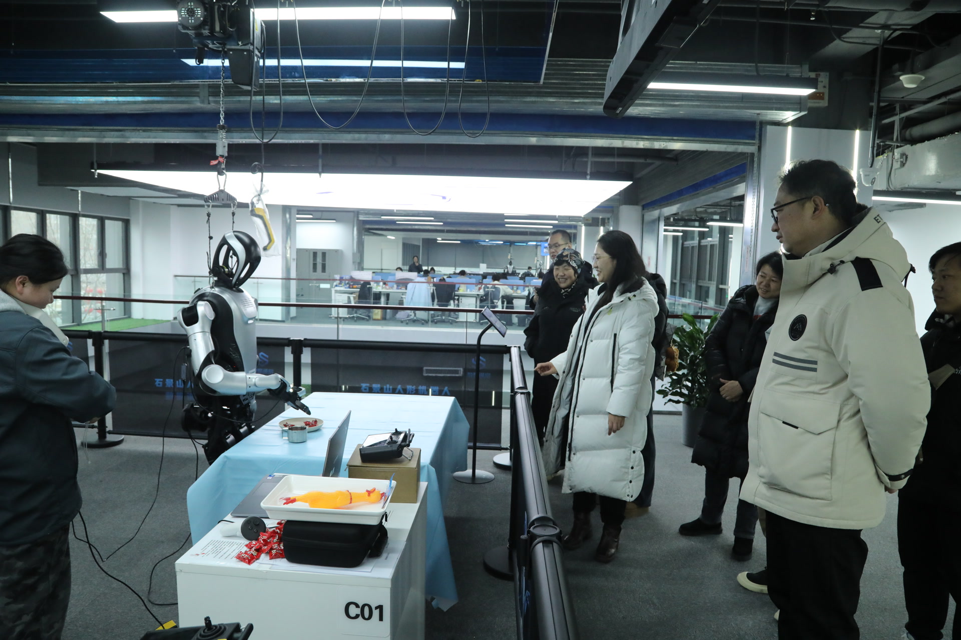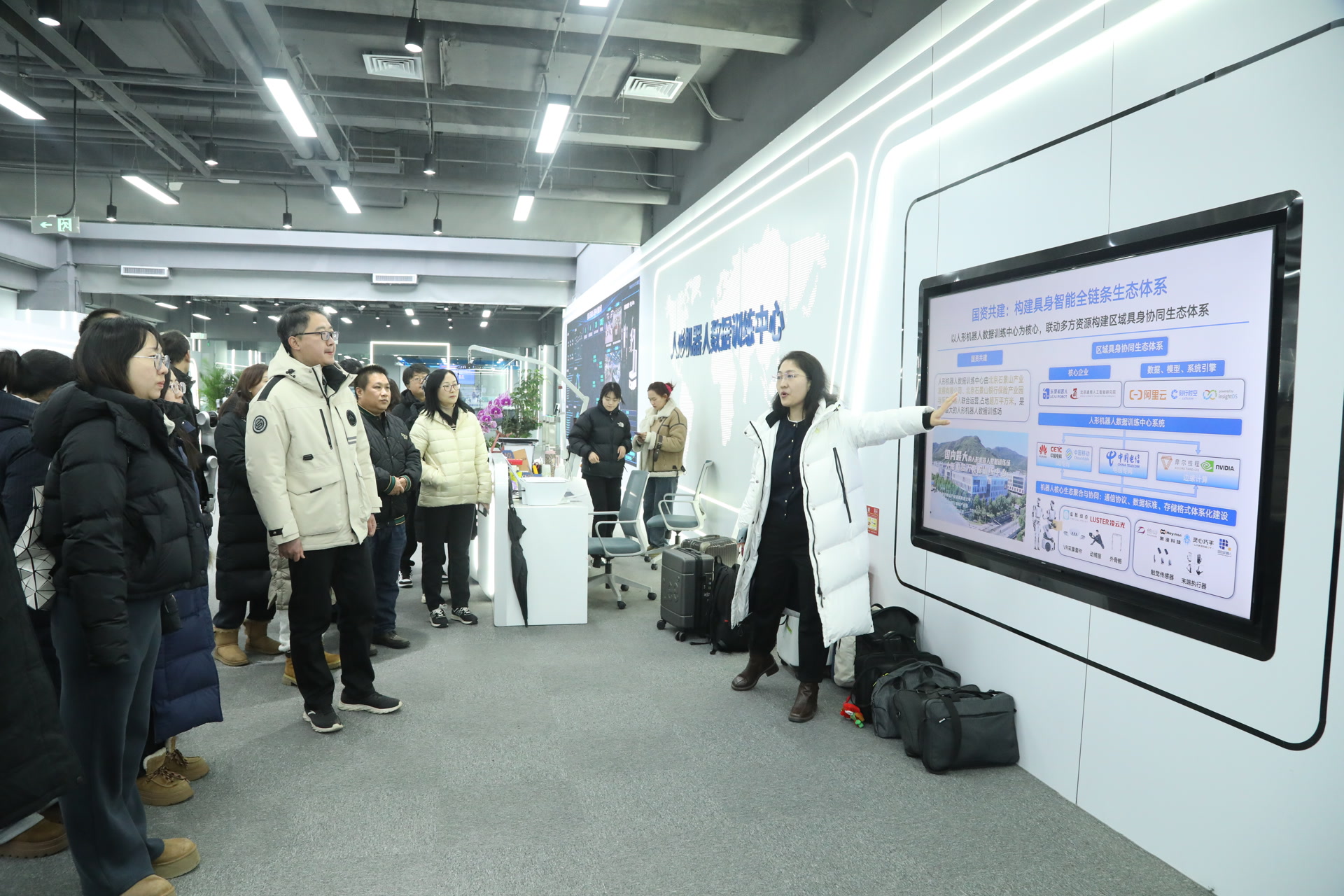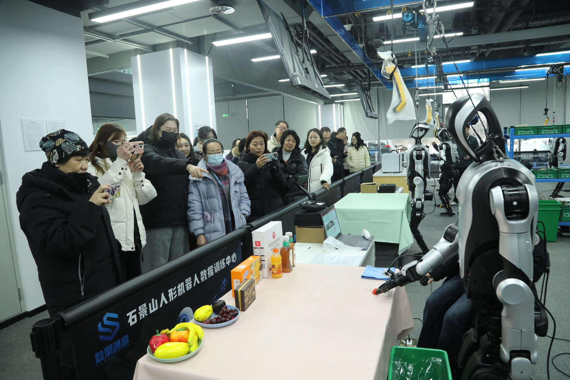 石景山人形机器人数据训练中心作为北京首个人形机器人专业训练基地,总占地面积超万平方米,创新打造“训练+应用+孵化+科普”四位一体产业生态,覆盖工业智造、智慧康养等16个细分应用场景,年产出超百万条高质量多模态数据,为机器人具身智能迭代升级提供核心数据支撑与技术底座。在讲解员带领下,参观人员依次走进各模拟应用场景,近距离观摩具身双臂机器人康复辅助、轮式机器人环境巡检等实景演示,系统了解数据采集、模型训练、场景适配全流程技术逻辑,直观感受智能技术赋能基层治理、服务民生百姓的实践路径。