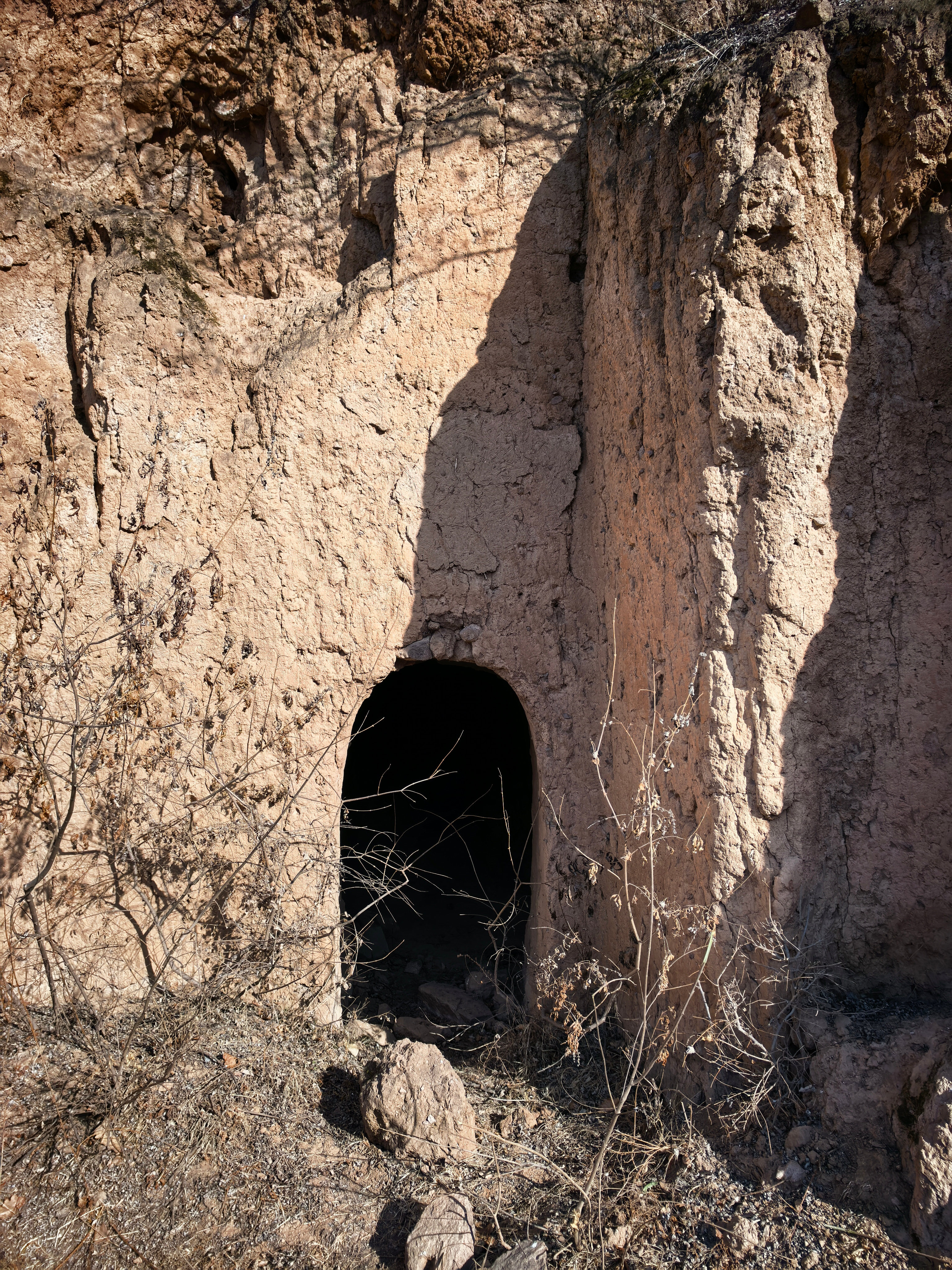 随后,探险队转战大南沟“专业队”片区,在沟谷北侧的台地上,6处土坎开挖土洞两片各3个山洞,古洞整齐分布,与小哈沁沟的天然开凿石古洞形成鲜明对比。这6处古洞均为人工开挖结构,洞口大小不一,最大的洞口高1.8米、宽1.1米,进入后变宽2.2米,进深11米,可直立进入;最小的洞口仅高1.4米、宽1.1米,进深3米,需弯腰爬行进入。土坯墙体厚约0.5米,土坯开挖工艺,与辽代北方民居建筑特征高度吻合,部分墙体虽有坍塌,但整体形制完整,能清晰看出门洞、瞭望口等结构。