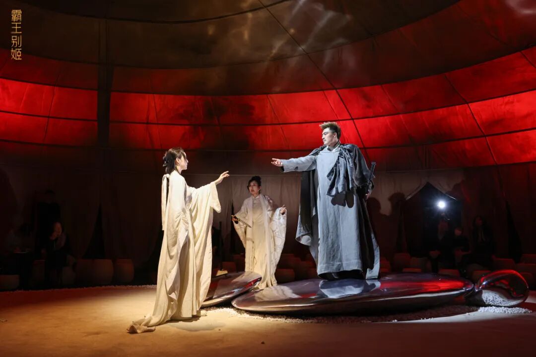 《霸王别姬》立足独特的女性视角展开叙事,家喻户晓的历史故事经由现代视角呈现,历史故事与现代观众产生情感连接。该剧打破传统镜框式舞台表演空间,设置360度环绕的穹顶军帐,观众身处其中可任意角度感受戏剧,享受沉浸式的观演体验。