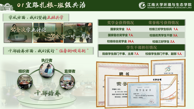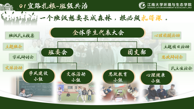 一个班级的成长,就像一颗种子,只有扎根于制度的土壤,才能向下扎根,向上生长。环工2201班聚力班团一体,厚植班风之基,积极落实“班团一体化”的要求,形成一个代表大会(班级代表大会),两大核心体系(班委会、团支部),四大功能组团(思政教育小组、学风建设小组、心理健康小组、文体活动小组)。