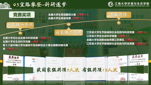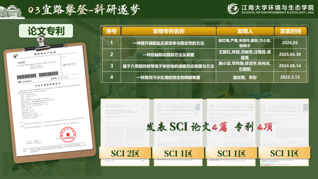 班级同学在环境工程、生命科学、低碳能源等领域积极探索,多名成员在国内外期刊发表论文,部分项目转化为发明专利或省级优秀成果。在国家级、省级赛事中屡获佳绩,涵盖节能减排、生命科学等领域,几乎每位成员都参与其中,形成“人人参与、人人成长”的科研竞赛文化。