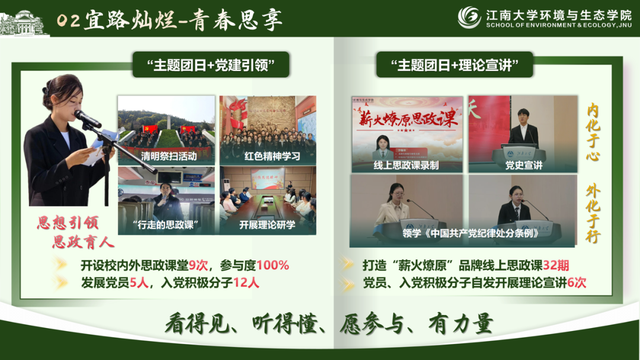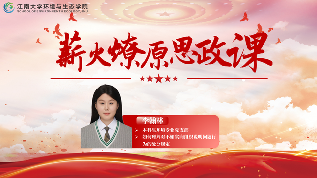 其次,开展“主题团日+理论宣讲”活动,联合本科生环境专业党支部打造“薪火燎原”品牌思政课32期,邀请党政领导、思政骨干、大国工匠、优秀学生骨干等分享成长故事。李翰林、潘友翔围绕《中国共产党纪律处分条例》关键条款深入讲解,使责任意识和组织观念内化为行动自觉,实现理想信念与专业学习、班级建设的同频共振。