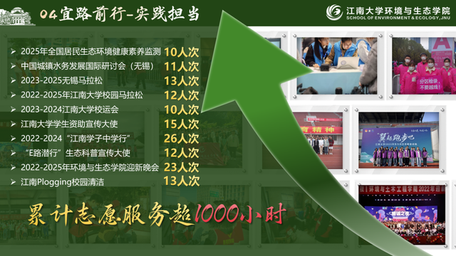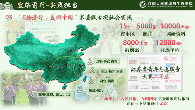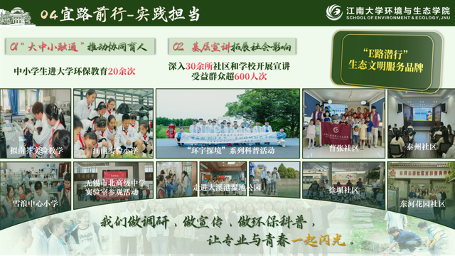 一是以“大中小融通”推动协同育人,邀请湖滨中学、南外国王国际学校等中小学生进校参观实验室、参与环保小实验,传播生态理念,培育少年力量;二是以基层宣讲拓展社会影响,组织志愿者60余人次深入大溪港湿地公园、贡湖湾湿地公园、夏家边社区等40余家社区、学校,开展宣讲与科普讲座20余场,惠及群众800余人次;三是开展“E路潜行,美丽中国”寒暑假专项社会实践,组织100余人次前往安吉余村、正定、厦门等地开展环保宣讲、支教支农等活动,辐射全国15省市,受益千余人,深入乡村一线,助力美丽中国。