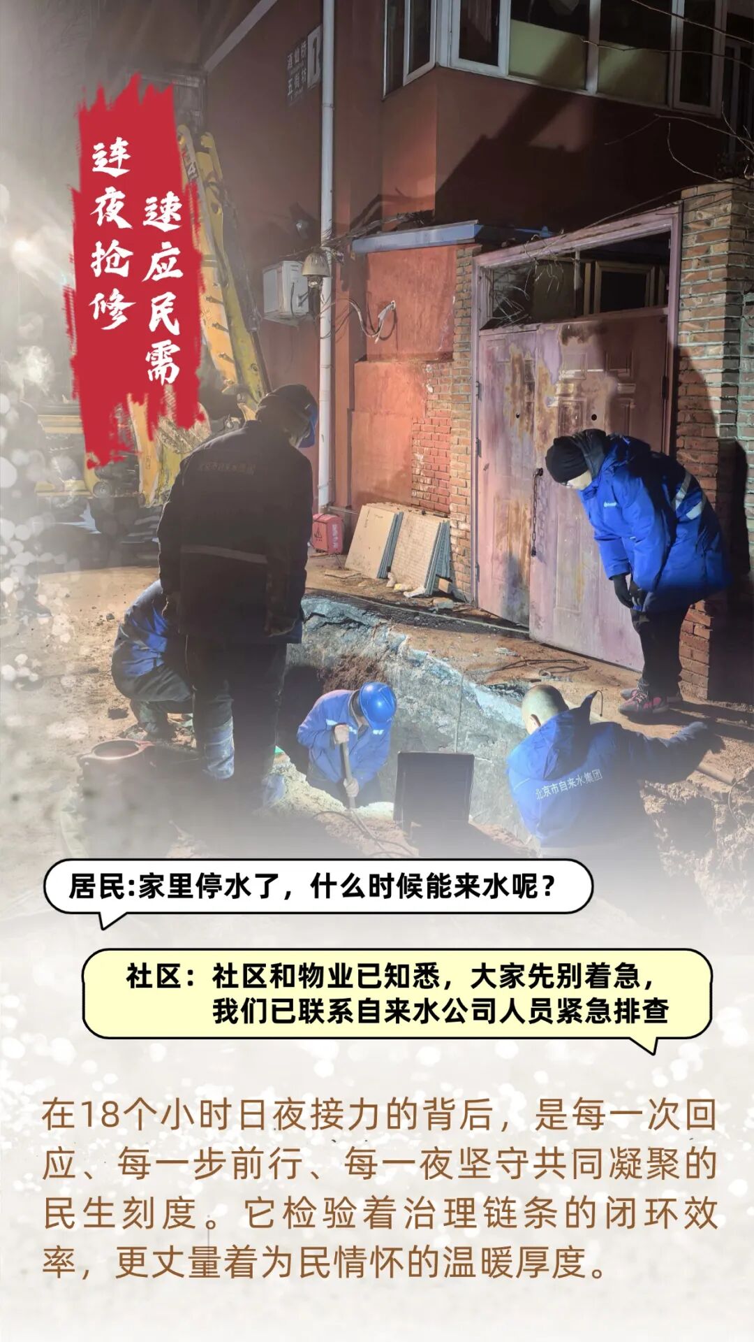 为最大限度减少扰民,社区主动协调,将重型机械作业提前至晚21时30分前结束,后续改用人工静音挖掘。寒夜刺骨,人心却暖。直至深夜23时,管道终于修复,清流重返家家户户。