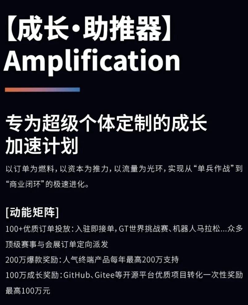 对具备潜力的早期项目,社区建立“技术人才挖掘—技术大牛认证—OPC项目落地”的漏斗式筛选培育计划,经评审最高给予200万元专项资金支持;对GitHub、Gitee等平台优质开源项目实现商业化转化的,一次性奖励最高100万元,让创意真正变成价值。