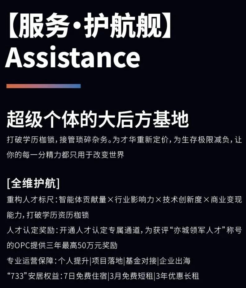 打破传统标尺,让实力被看见。我们重塑人才认定逻辑,推出以“智能体贡献量、行业影响力、技术创新度、商业变现力”为核心维度的新型评价体系。不看资历看能力,不唯证书唯实效。开通人才认定专属通道,为获评“亦城领军人才”称号的OPC提供三年最高50万元奖励,让每一个有实力的超级个体都能获得真实认可与实质激励。