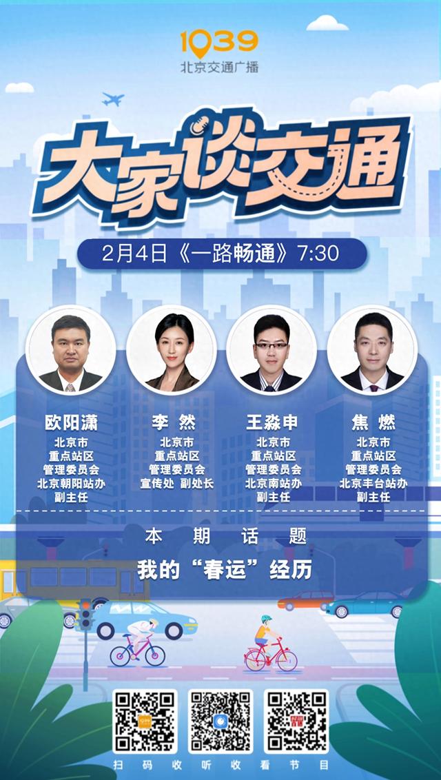 【直播预告】2月4日7:30 北京交通广播 《一路畅通》栏目邀请北京市重点站区管委会北京朝阳站办副主任欧阳潇、管委会宣传处副处长李然、北京南站办副主任王淼申、北京丰台站办副主任焦燃一起聊聊《我的“春运”经历》。