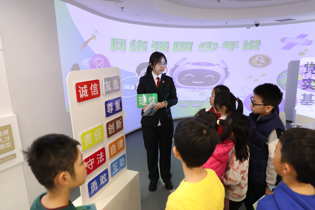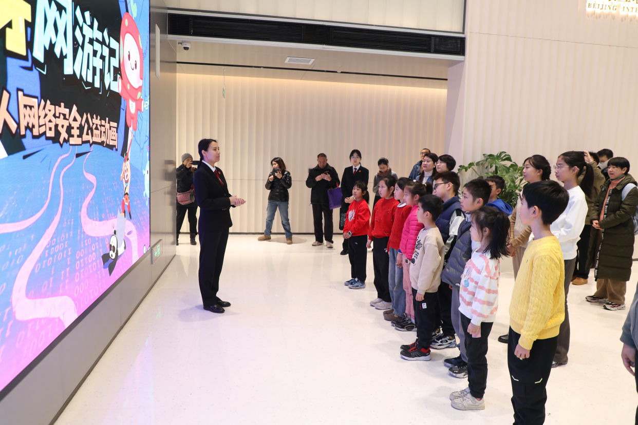 在首映式后的研学环节,青少年网络素养寒假研学团参观了坐落于北京互联网法院的北京市青少年网络素养教育实践基地,通过沉浸式深度参观互联网法庭,结合6到12岁年龄段孩子的认知能力、用网习惯等特点,以“网络e星球探索”为趣味故事主线,为学生们带来了一场趣味法治探索之旅,极大激发了学生们对文明上网、安全上网的关注,在他们心中播下了未来法治建设的种子。