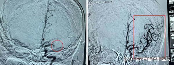 ▲术前:红圈处血管阻塞 ▲介入术后:血管畅通