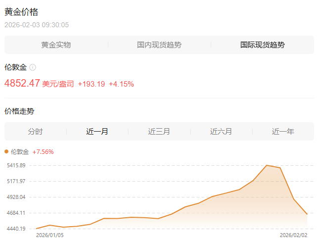 2月3日,现货金银日内走高。截至9:30,现货黄金涨至4852.47美元/盎司,日内涨4.15%。