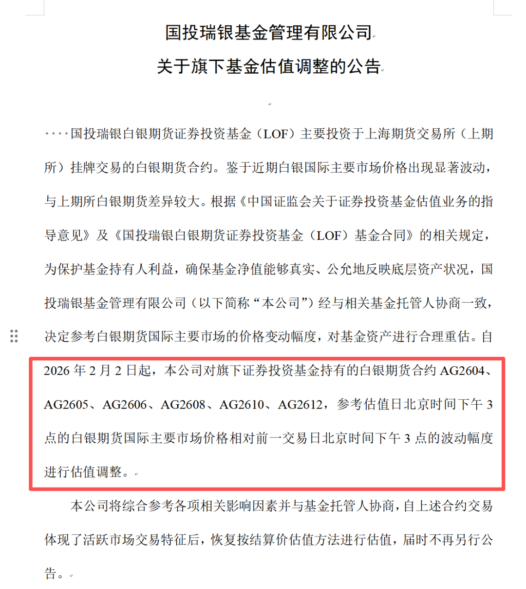 同日晚间,国投白银LOF最新公告称,鉴于近期白银国际主要市场价格出现显著波动,与上期所白银期货差异较大,国投瑞银经与相关基金托管人协商一致,决定参考白银期货国际主要市场的价格变动幅度,对基金资产进行合理重估。
