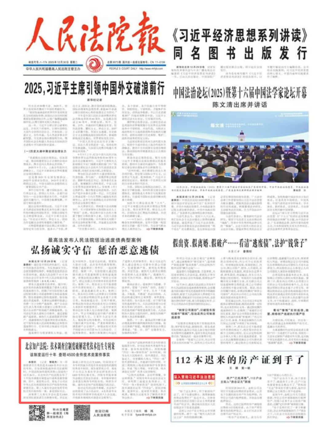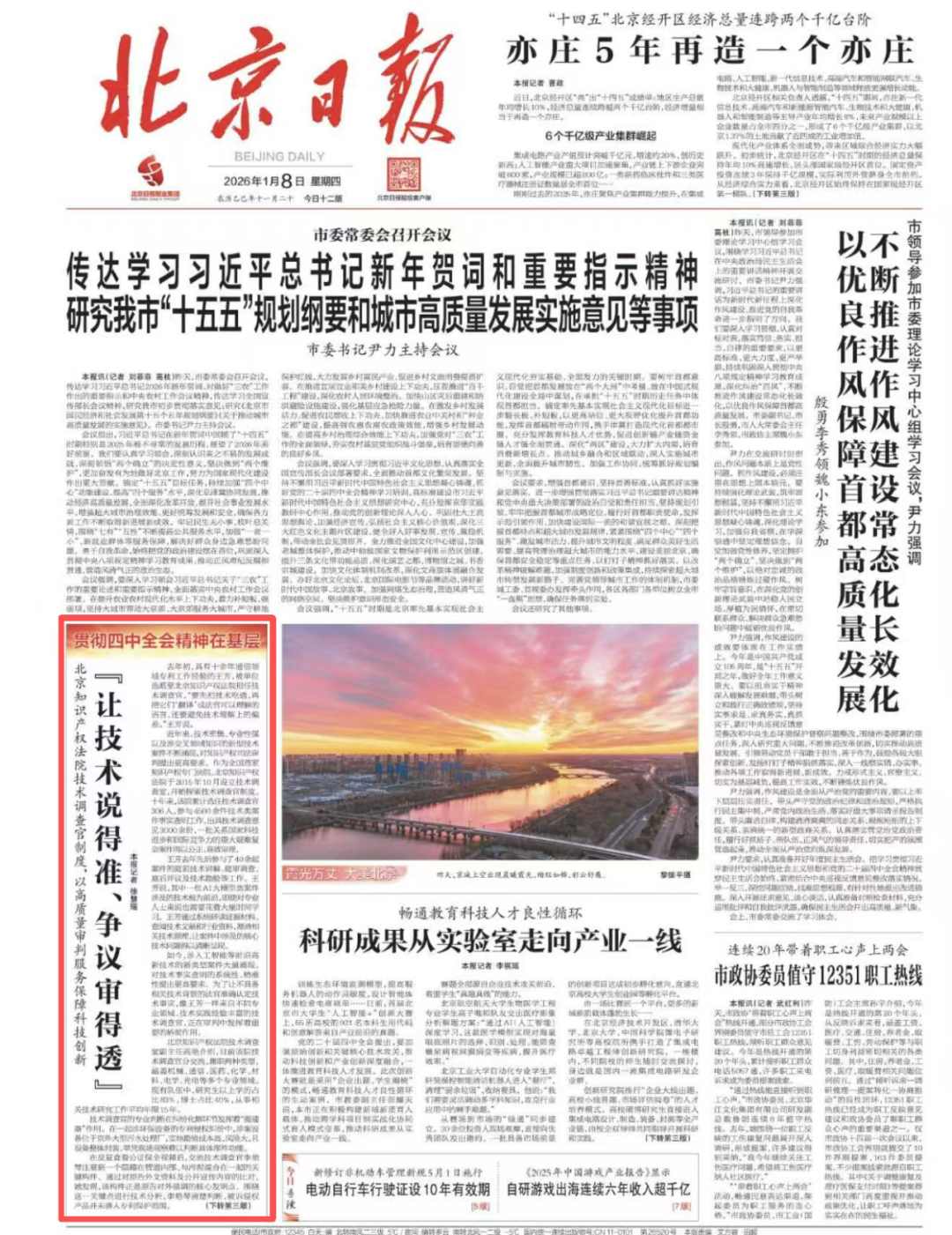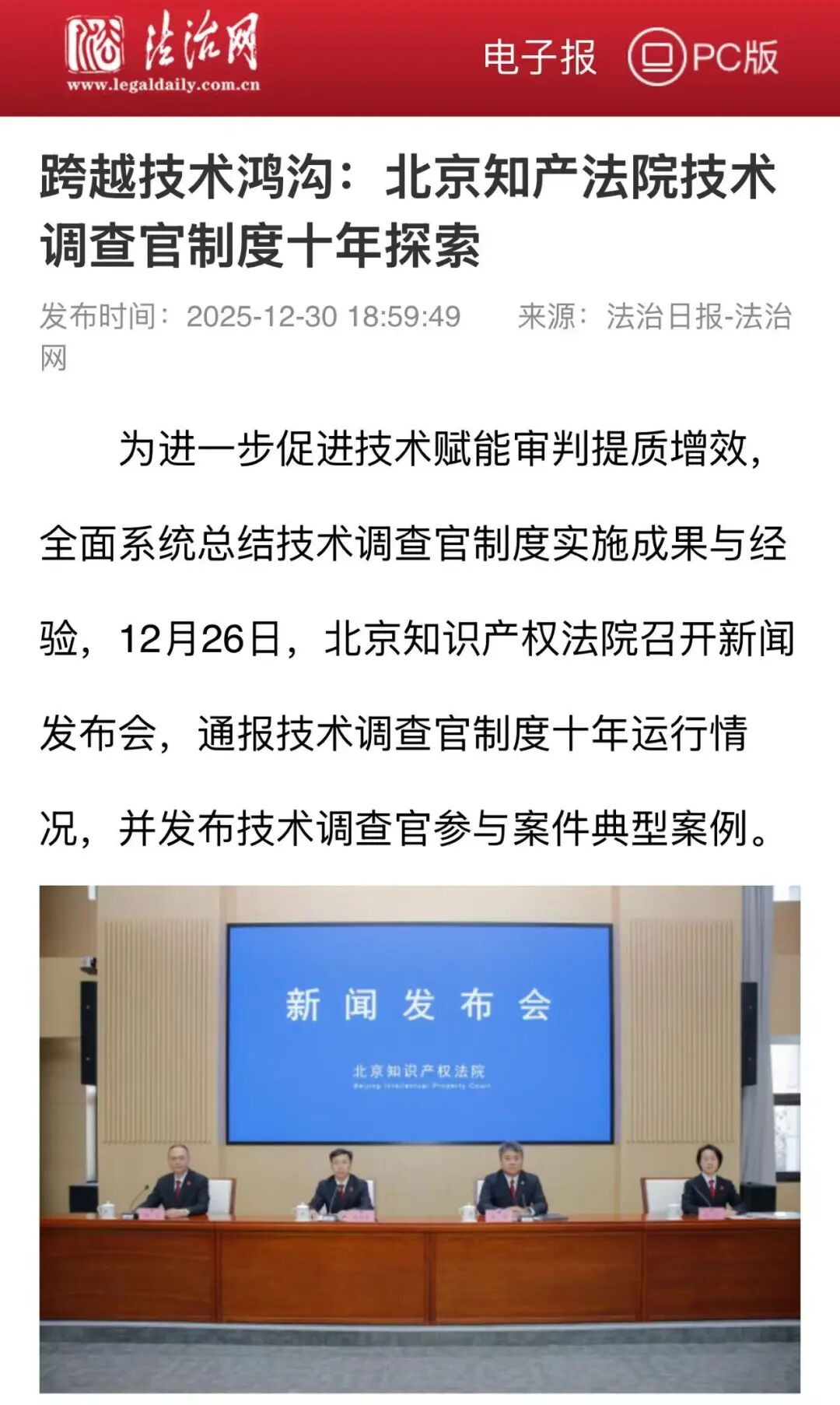 12月26日,北京知识产权法院召开技术调查官制度十年运行情况发布会。会议受到社会广泛关注,获得中国日报、中国妇女报、法治日报、人民法院报头版、北京日报头版、北京广播电视台等媒体报道。