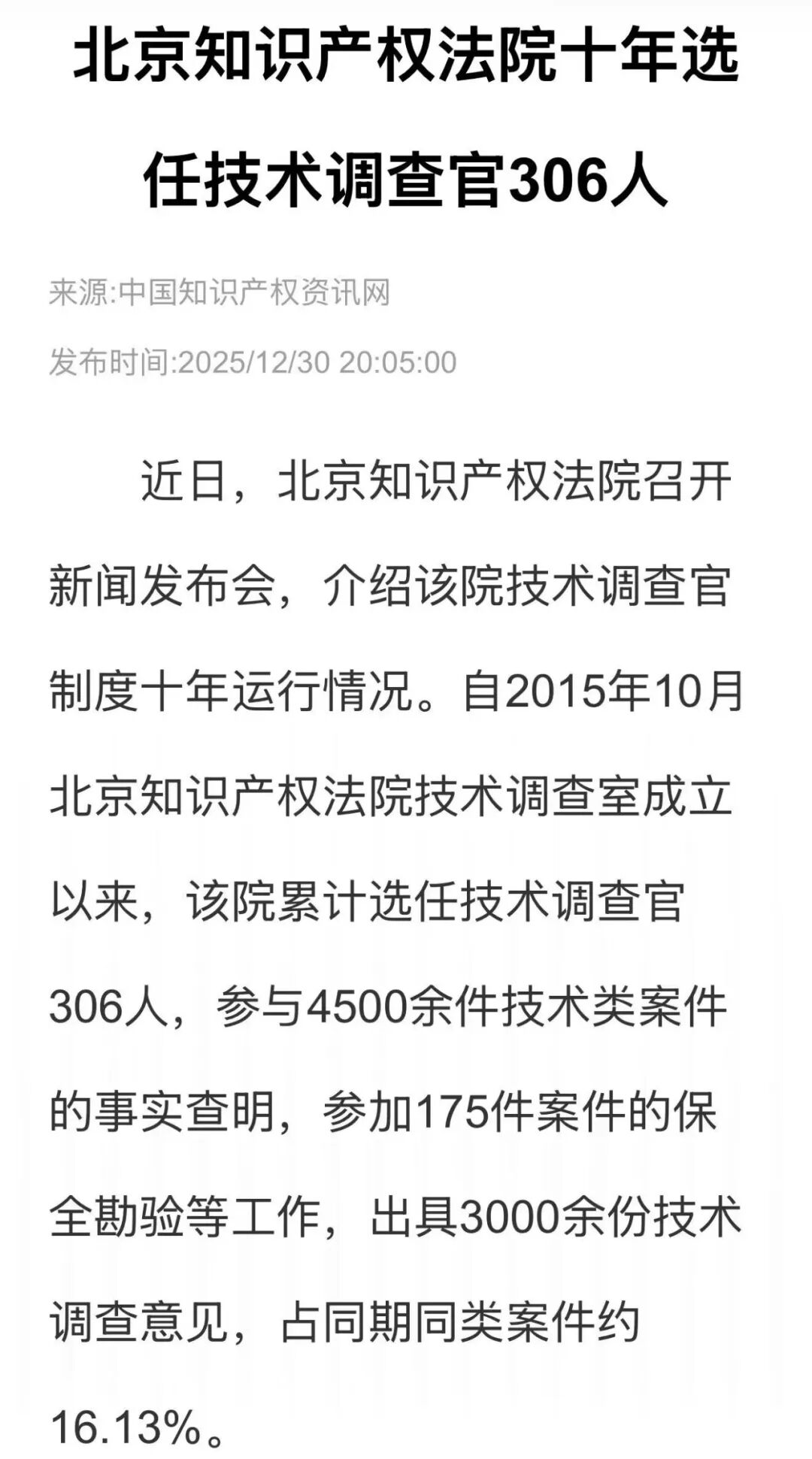 北京知产法院十年选任技术调查官306人,