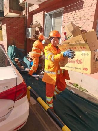 椿树街道联合辖区单位、商户、志愿者及居民集中清理背街小巷、楼道院落、垃圾站点等区域,清除卫生死角、清运积存垃圾,以洁净环境迎接新春。