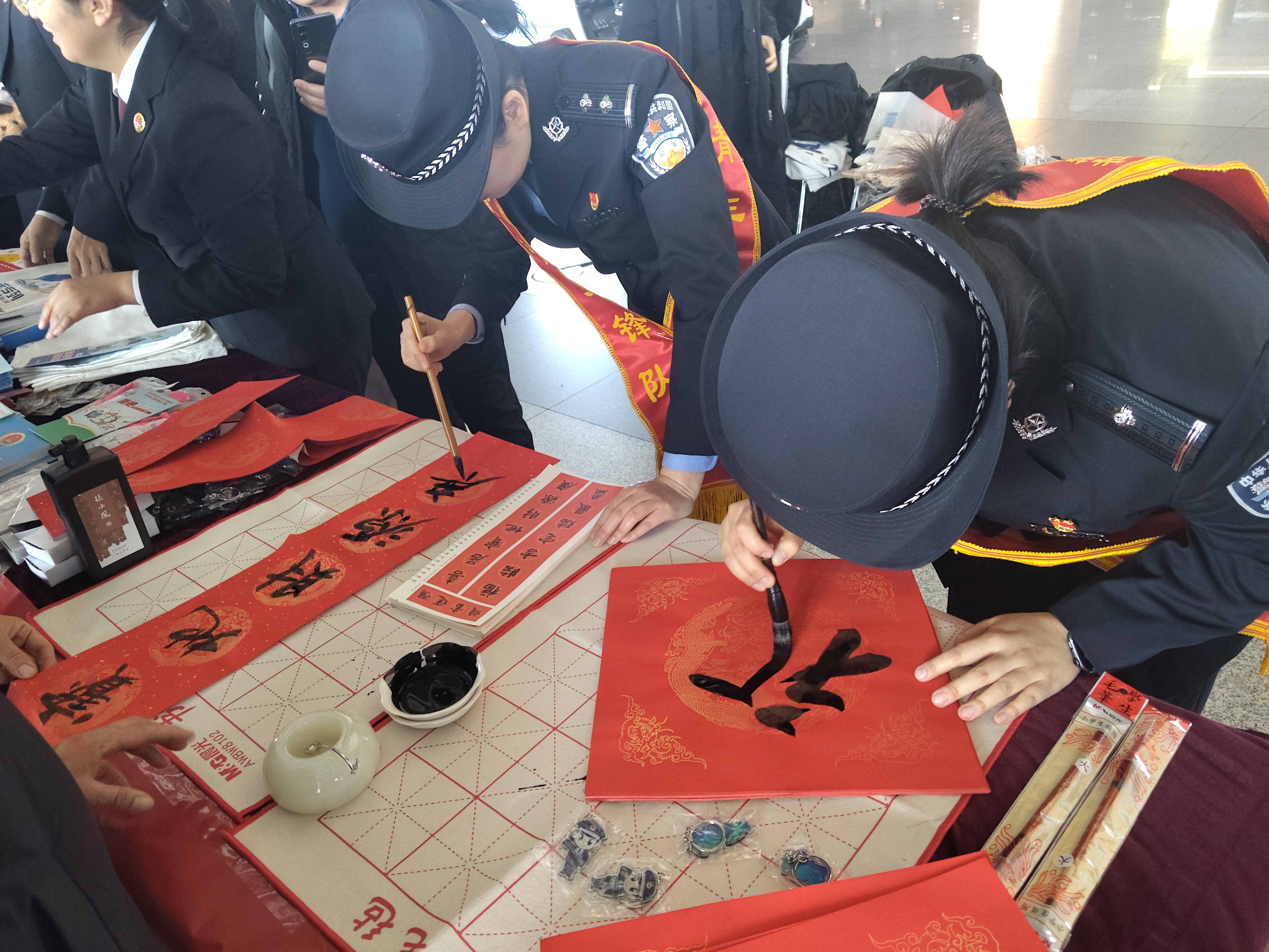 “祝您旅途平安,也请一定警惕陌生来电!”在站内显眼的南侧牌匾下,工作人员和民警一边送上飘着墨香的手写春联和“福”字,一边送上贴心的安全叮嘱。这份特殊的“年货”,让许多旅客惊喜驻足,笑意盈盈地接过祝福,也将安全提醒牢牢记在心里。