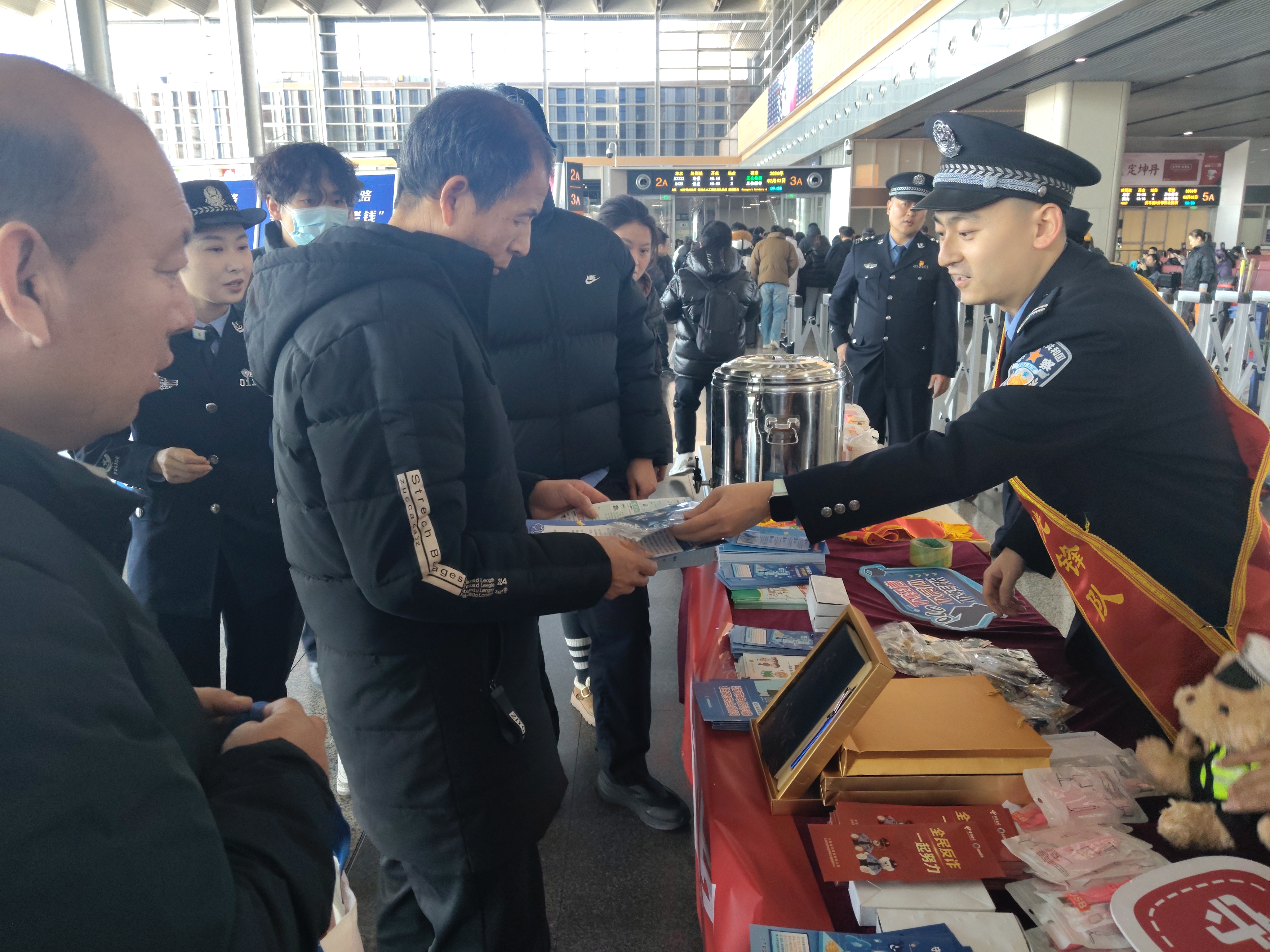 为守护旅客的“钱袋子”和旅途平安,丰台站办联合铁路公安、铁路检察院、新村街道等部门,在2026年春运第一天,把反诈“宣”出了新花样。一个融合了新春送福、情景剧场、互动科普的创意空间,瞬间让候车区变身温馨又充满知识趣味的“安全驿站”。