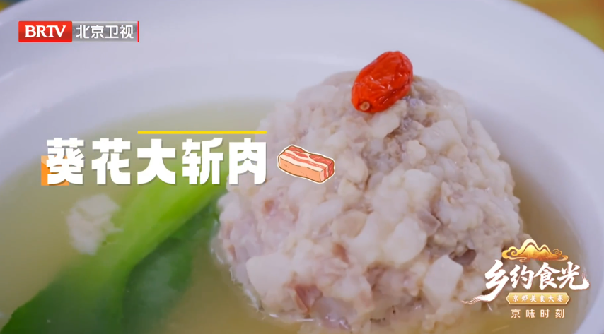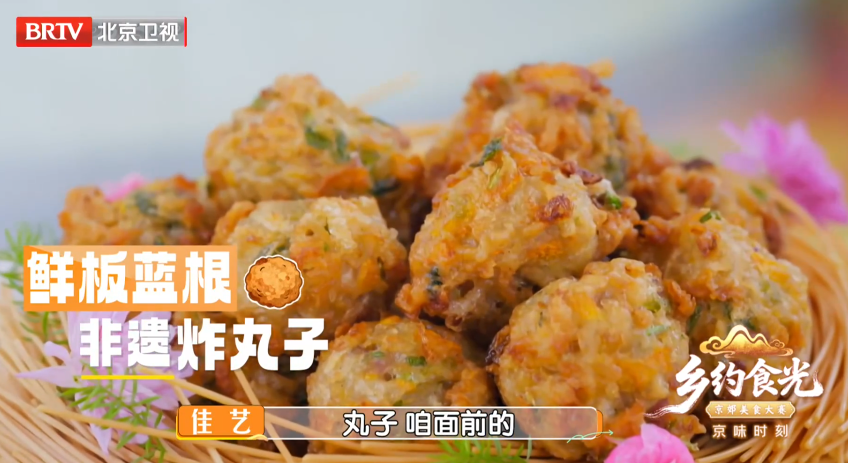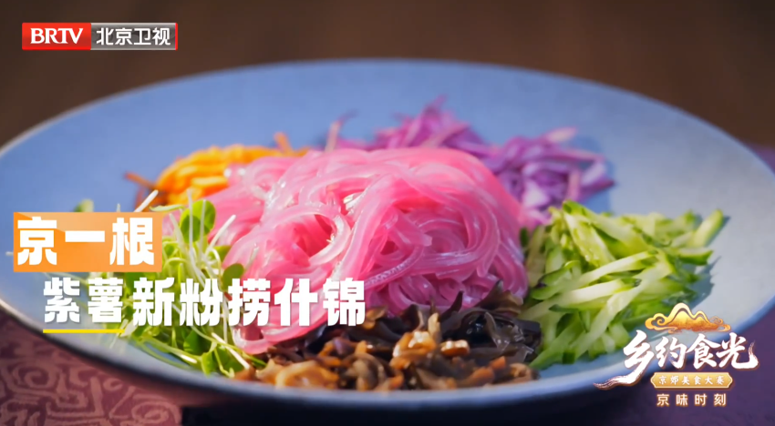 张踩铃钟情于菊花白醉三样,这是用国家级非遗菊花白酒沁入鲜虾、毛豆与鸡胗,酒香清雅,口感层次直接拉满。京一根紫薯新粉捞什锦被大胖媳妇用一曲《甜蜜蜜》盛赞。京一根是房山区级非遗粉条,它讲究的是一根不断,传承了七代手艺。而玥小玥用戏腔推荐她最爱的鲜板蓝根非遗炸丸子,纯素食材却吃出满口清新……每一道菜,都有一首主题曲,吃得那叫一个有声有色!
