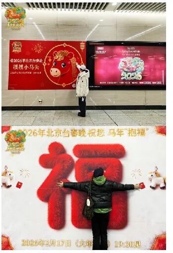 本次线下联动的核心亮点,是由北京台春晚联动北京地铁精心打造,分布于朝阳门、花庄、郝家府、团结湖四大地铁站点的沉浸式春晚主题打卡地。通过一系列融合传统年俗与现代互动的创意装置,将新春的喜庆氛围转化为可触摸、可参与的温馨体验。“马年抱福”吸引乘客拥抱互动,传递温暖新春祝愿;“财源广进”与“平安喜乐”的背景墙设立专属合影点位,供市民记录美好瞬间;“摸马头”互动墙则以生动有趣的形式,寄托马年顺遂的吉祥寓意。花庄站内还布置新春祝福玻璃贴,并设置祝福明信片自取点位,让市民在通勤途中即可收获新春好运,感受浓厚节日氛围。这些精心布置的装置自亮相以来,预计每日可触达人数近30万次,一场连接现代都市节奏与传统文化脉络、覆盖数百万市民的沉浸式新春体验,正从这里悄然启幕。