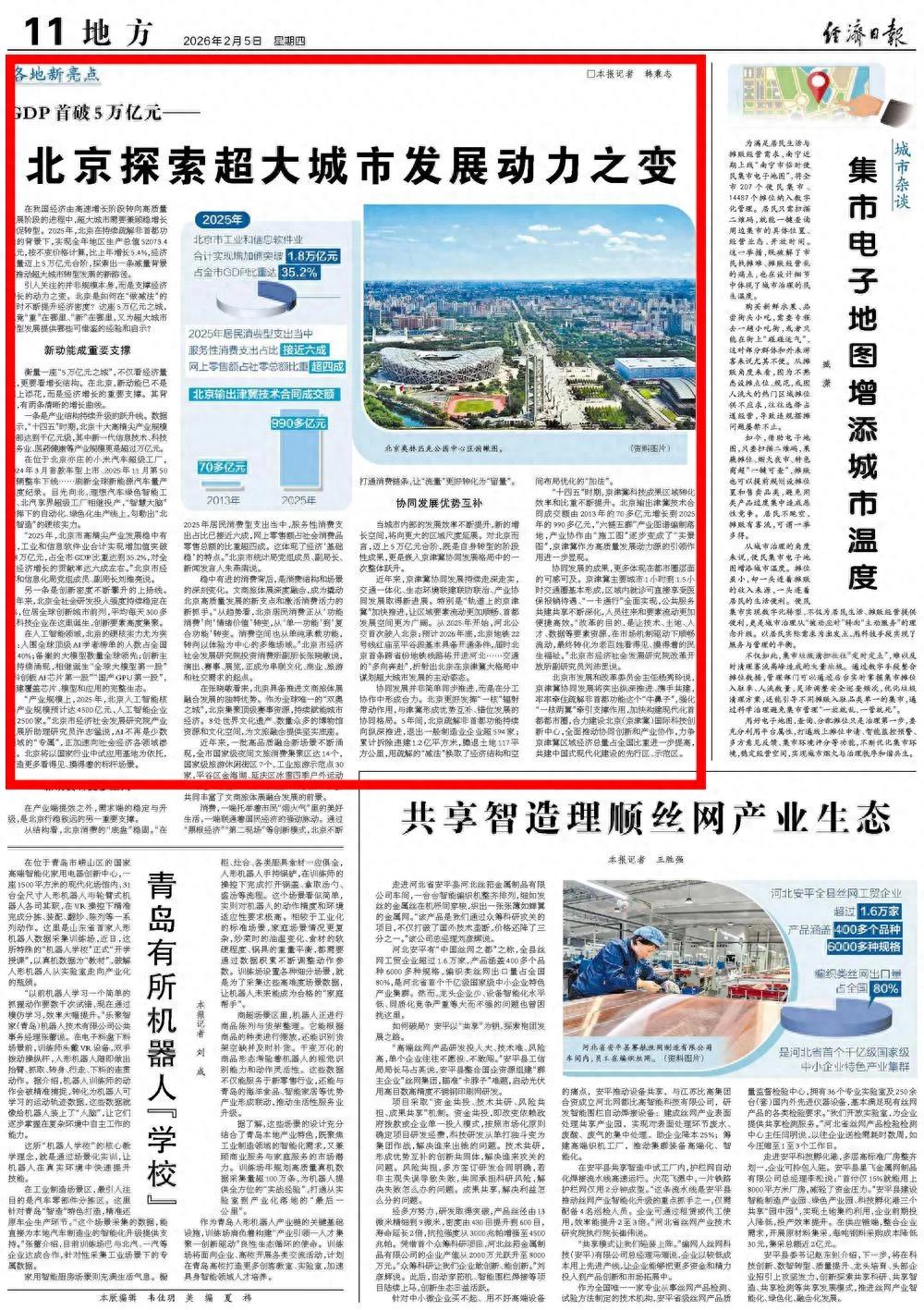当城市内部的发展效率不断提升,新的增长空间,将向更大的区域尺度延展。对北京而言,迈上5万亿元台阶,既是自身转型的阶段性成果,更是嵌入京津冀协同发展格局中的一次整体跃升。