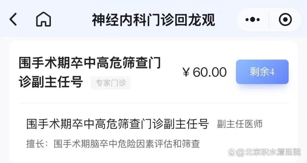 为保障手术患者安全、降低术后脑血管并发症风险,同时满足患者的诊疗需求,北京积水潭医院神经内科现已在新街口、回龙观、新龙泽三个院区开设“围手术期卒中高危筛查门诊”。