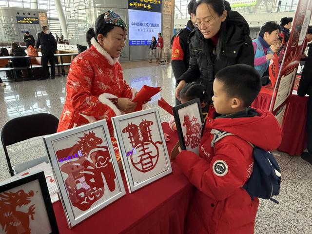 “播种春天”专区内,来自北京市种子管理站的志愿者们为大家讲述种子科普知识,介绍玉米、蔬菜等农作物优新品种,并将寓意着播种希望的“种子卡片”发放给旅客朋友,邀大家一同播种春天、种下希望。“立春节俗”专区内,志愿者娓娓道来立春节气的由来与传统雅俗,邀旅客亲身参与手工剪纸,体验传统工艺,在互动交融中传承中华优秀传统文化、感悟节气文脉魅力;“春暖归途”“一路生花”专区,一个个暖手宝、一朵朵鲜花被送到旅客手中,驱散冬日寒凉,传递新春暖意与站区温度。