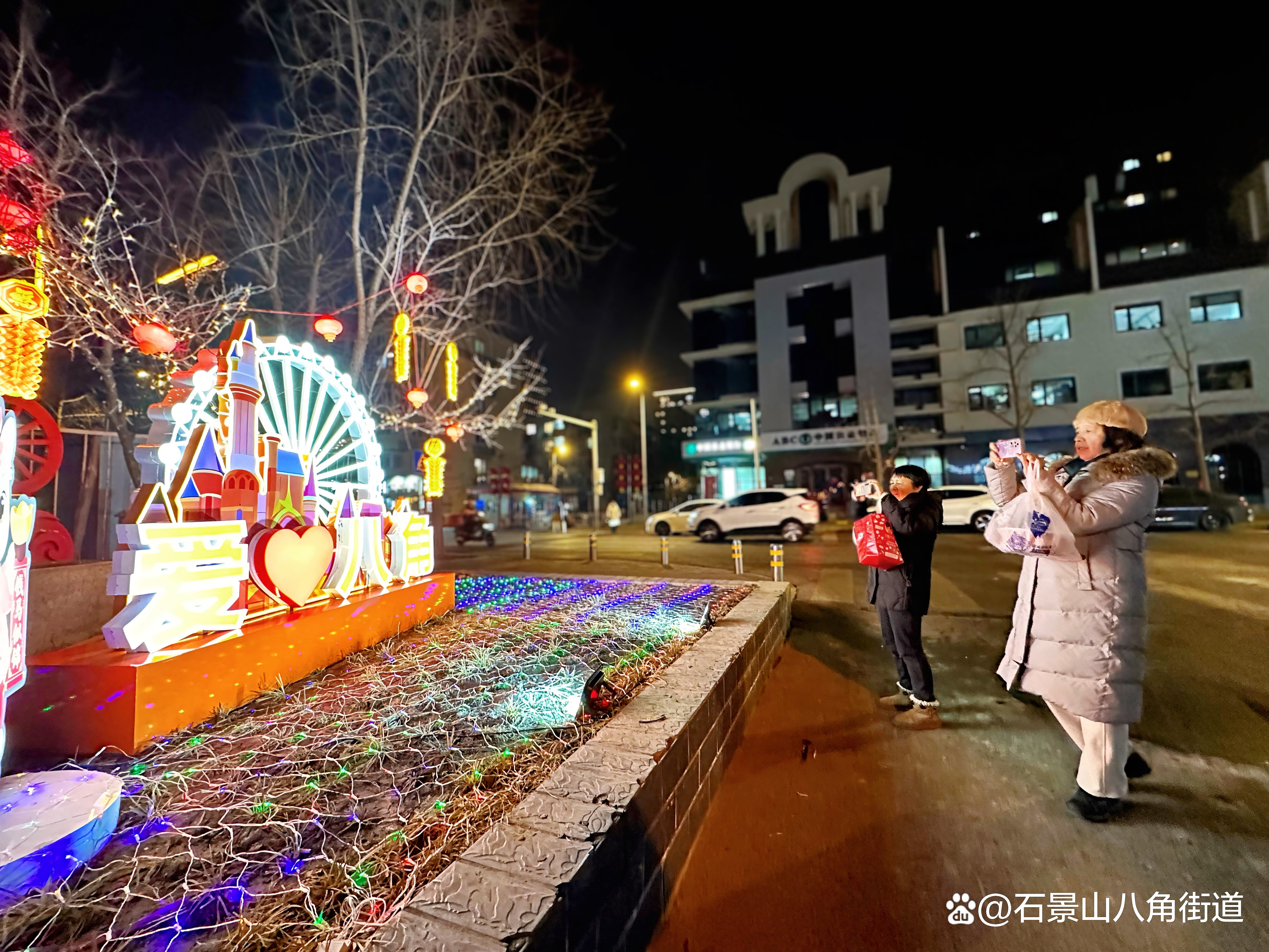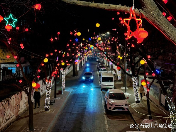 本次景观布置以灯笼灯饰为核心载体,融入马年生肖元素与中华传统文化,兼顾观赏性与文化性,构建炫彩缤纷、特色鲜明的节日景观,让居民在布设景观中感受传统节日魅力。八角北小路及八角北小街沿道路两侧树木系统布置装饰,在枝干间错落悬挂串灯、红灯笼、各类装饰灯,让灯光与树影交织,喜庆灯光串联起路段,传递新春的热闹与祥和。八角中里小区门口开展童话主题布设,在小区出入口两侧对沿途树木进行灯笼装饰、串灯缠绕等装饰,展现摩天轮下的童话社区特色,与石景山游乐园交相呼应。