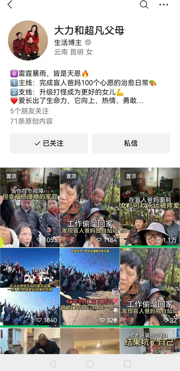 大力是一位自媒体博主,打开她的账号“大力和超凡父母”,映入眼帘的是一行温暖的主页介绍:“完成爸妈100个心愿的治愈日常。”