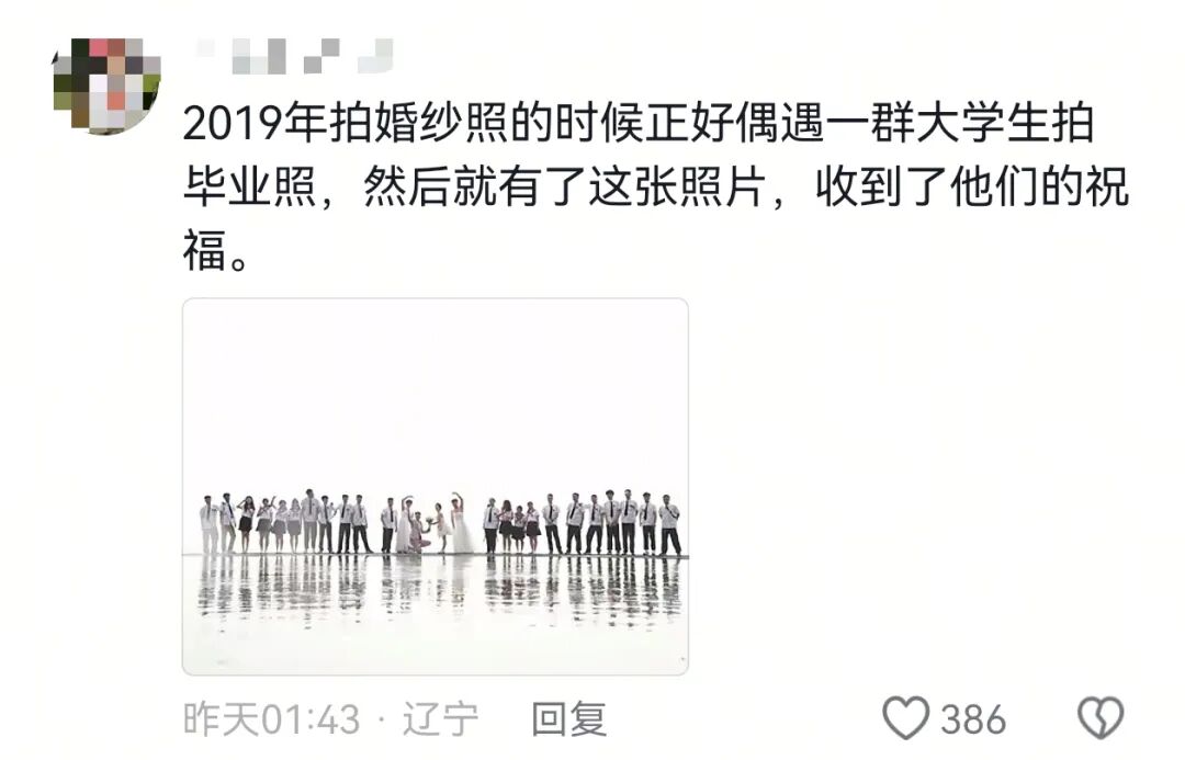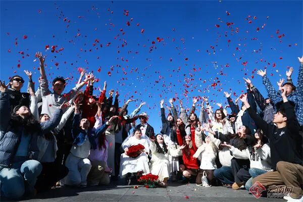 摄影师随即邀请大家一起入镜,没想到,合影的路人来了一波又一波。快门按下的瞬间,大家把玫瑰花瓣轻轻剥开,洒在空中。“那一刻真的太感动了,好像所有人都在为他们祝福。”大力也相信这会成为父母一生中最美好的一次回忆。