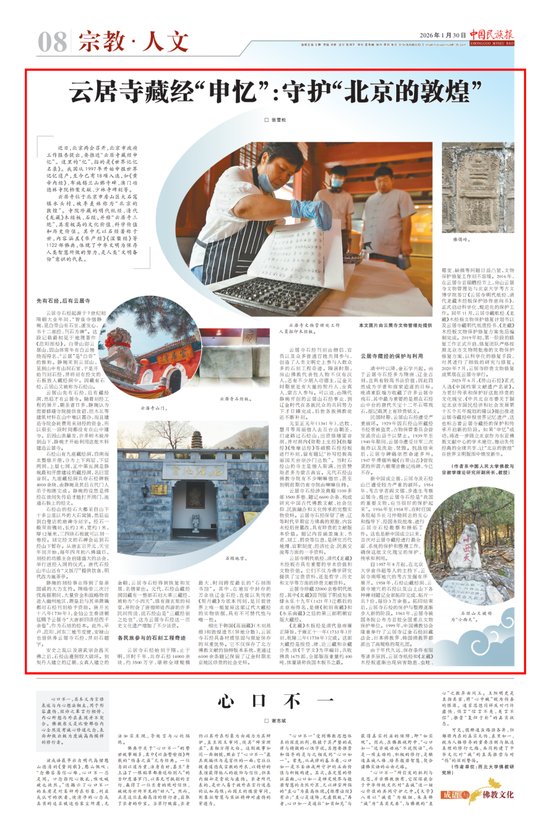 《中国民族报》最新刊载中国人民大学云居寺藏经重要价值及保护利用