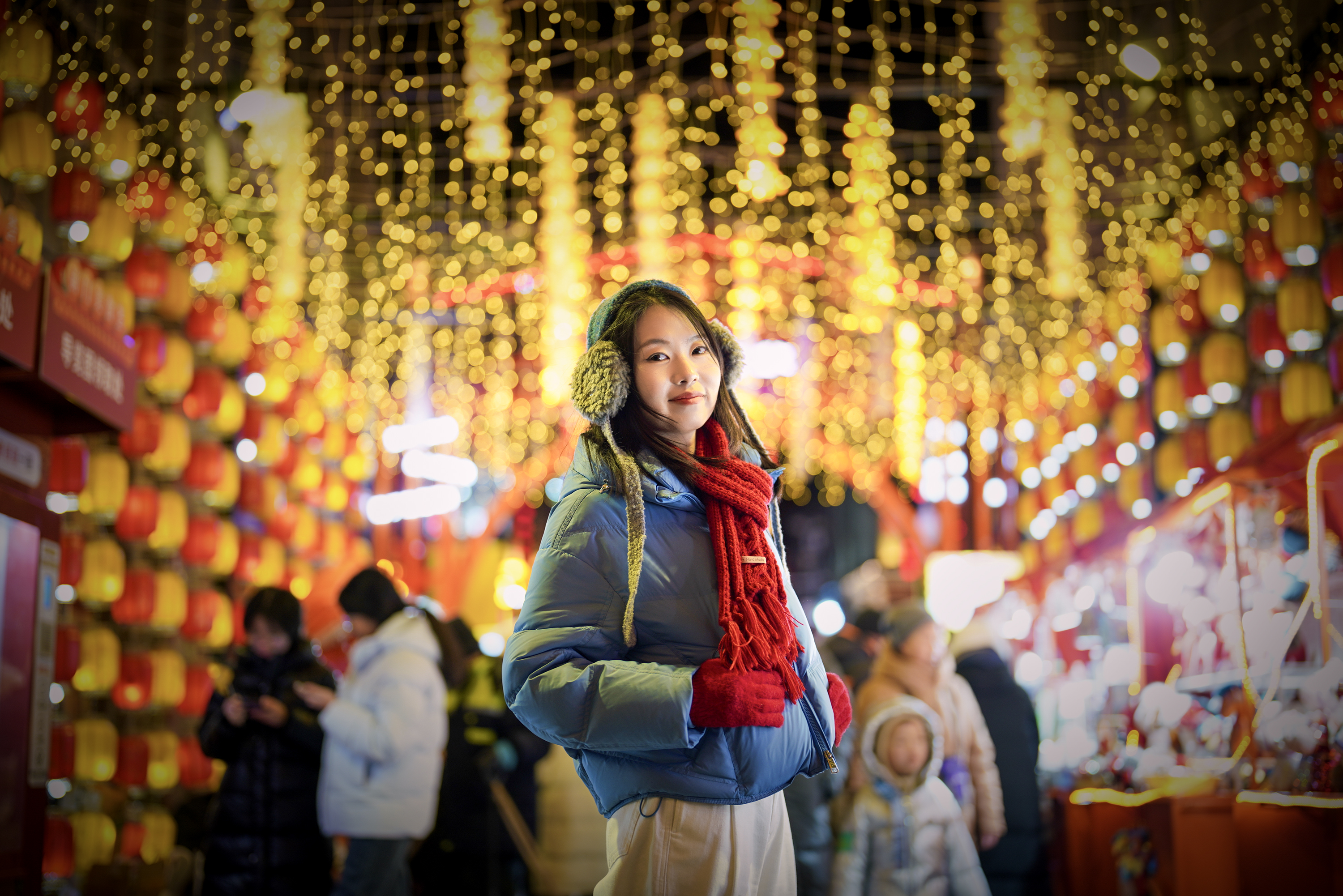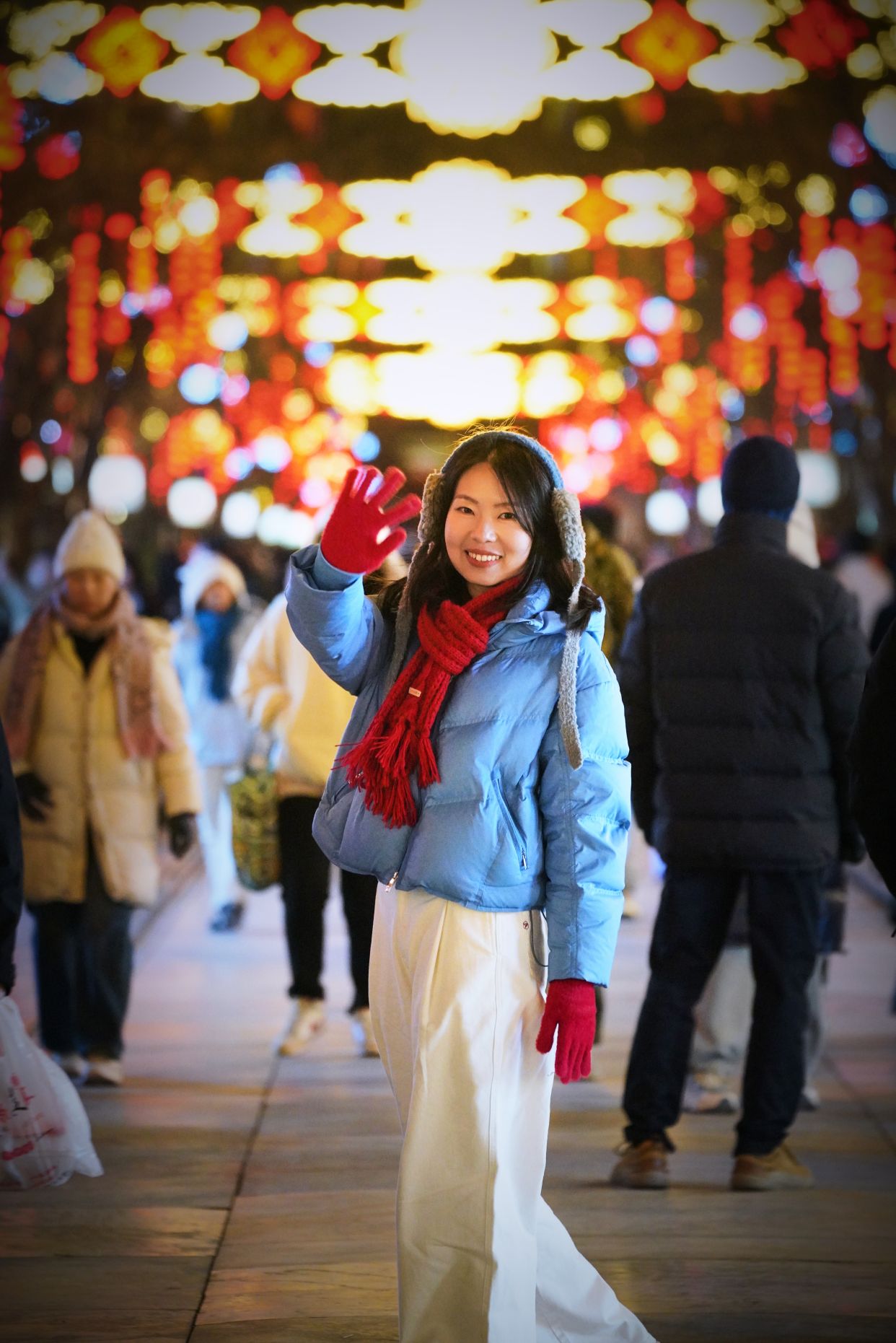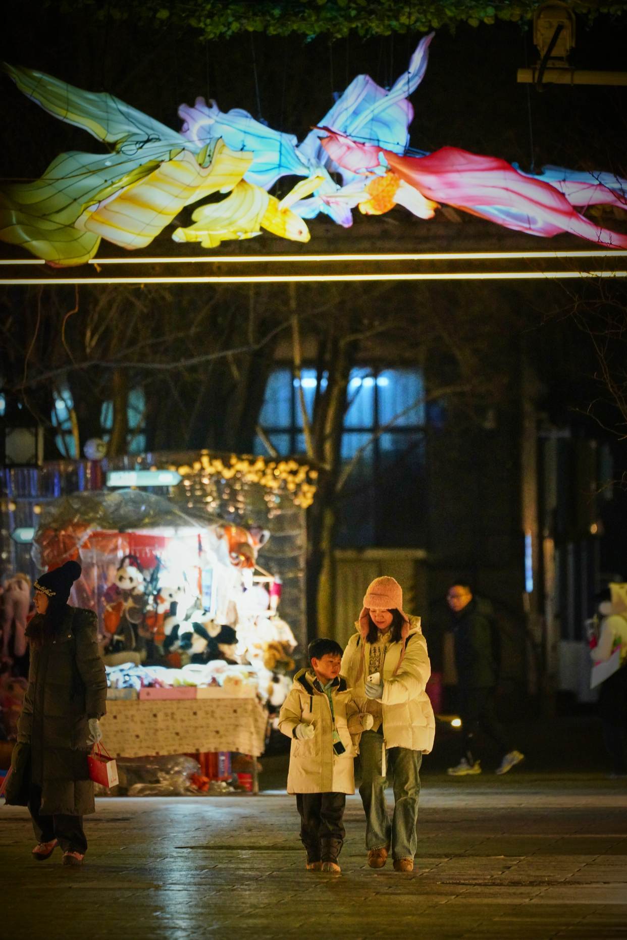 街上人潮熙攘,商铺橱窗灯火温软,游客的笑脸被彩灯映得明媚。街边巨型的毛绒福字喜气洋洋,橱窗里的“北京”字样醒目亮眼,无需刻意取景,随手一拍,便是年味氤氲的大片。