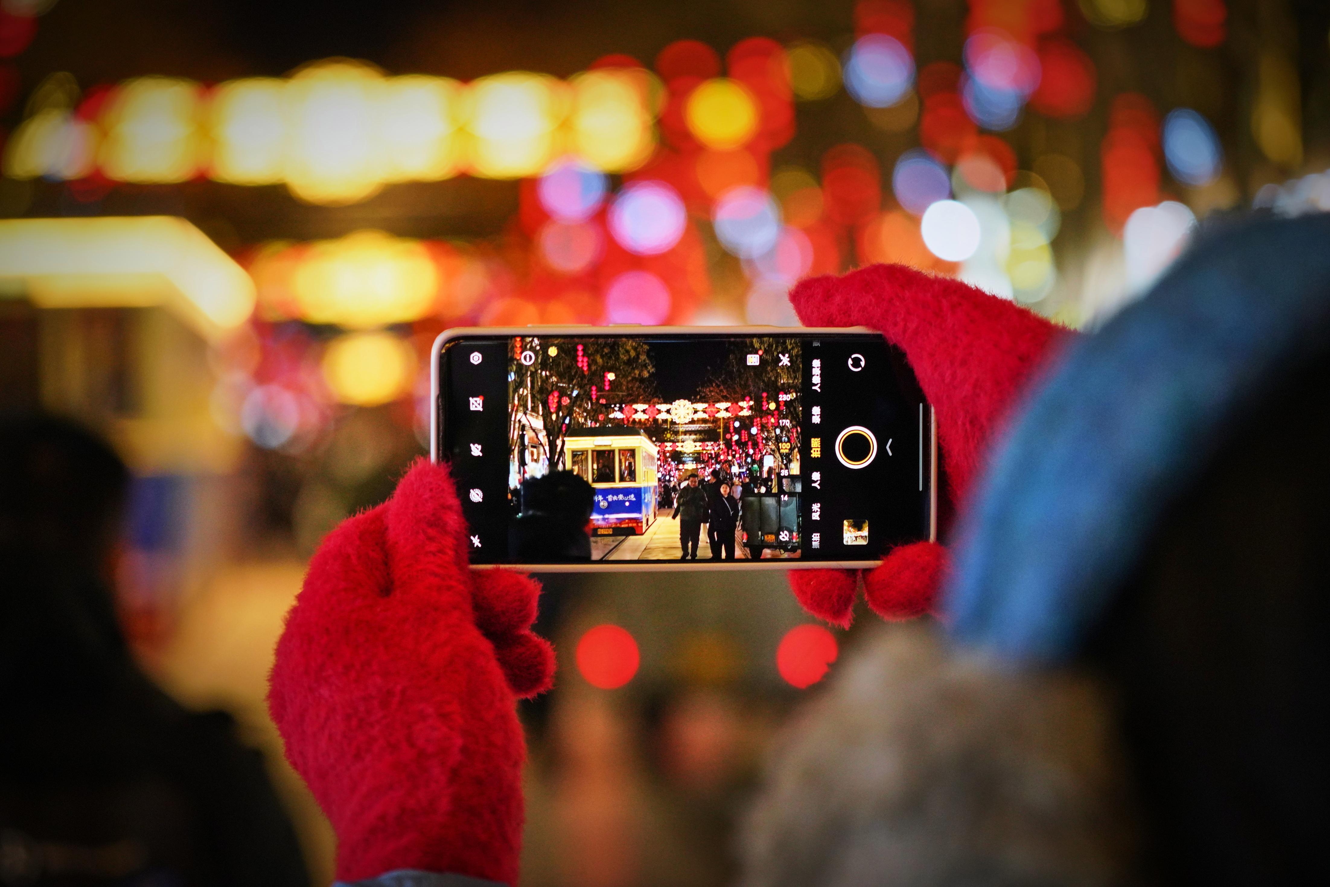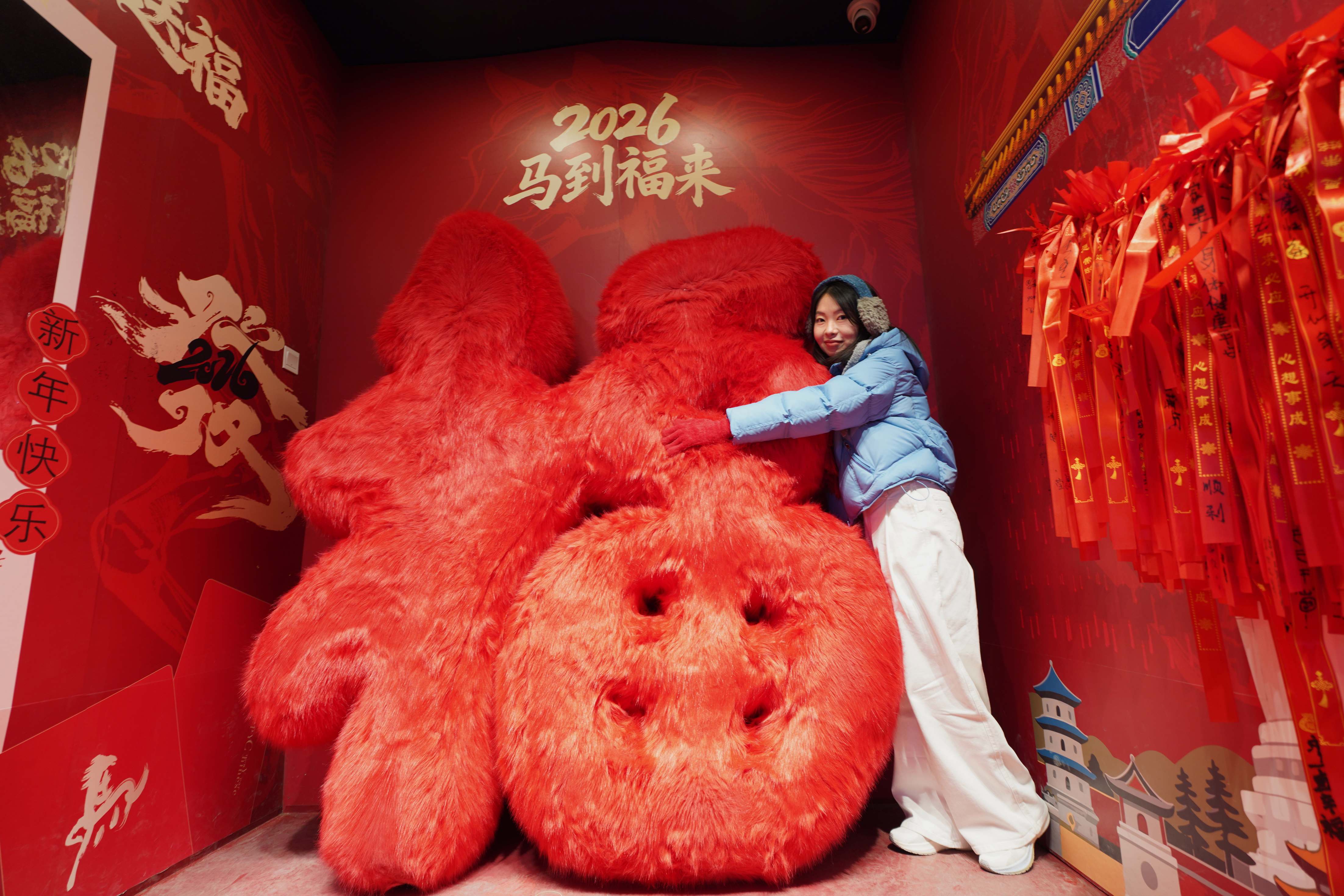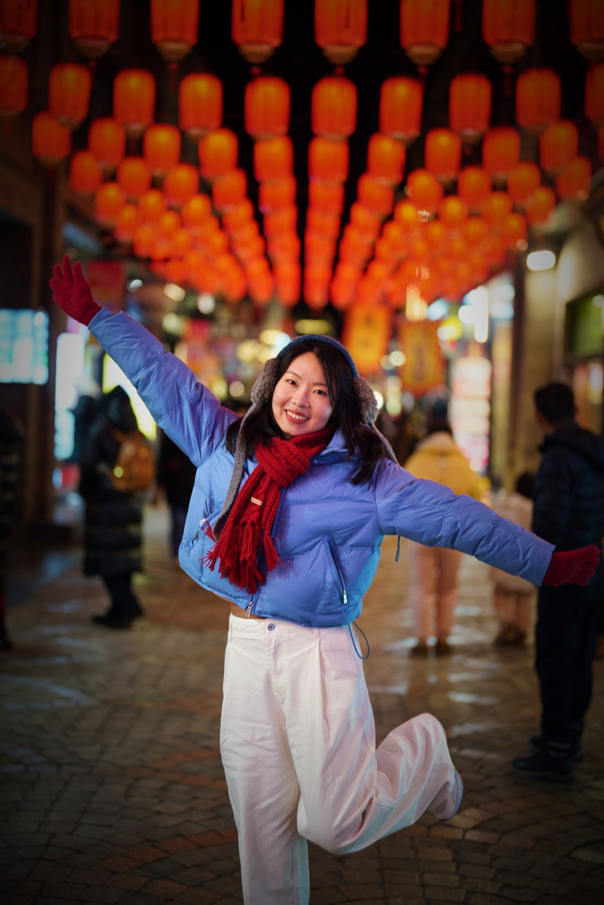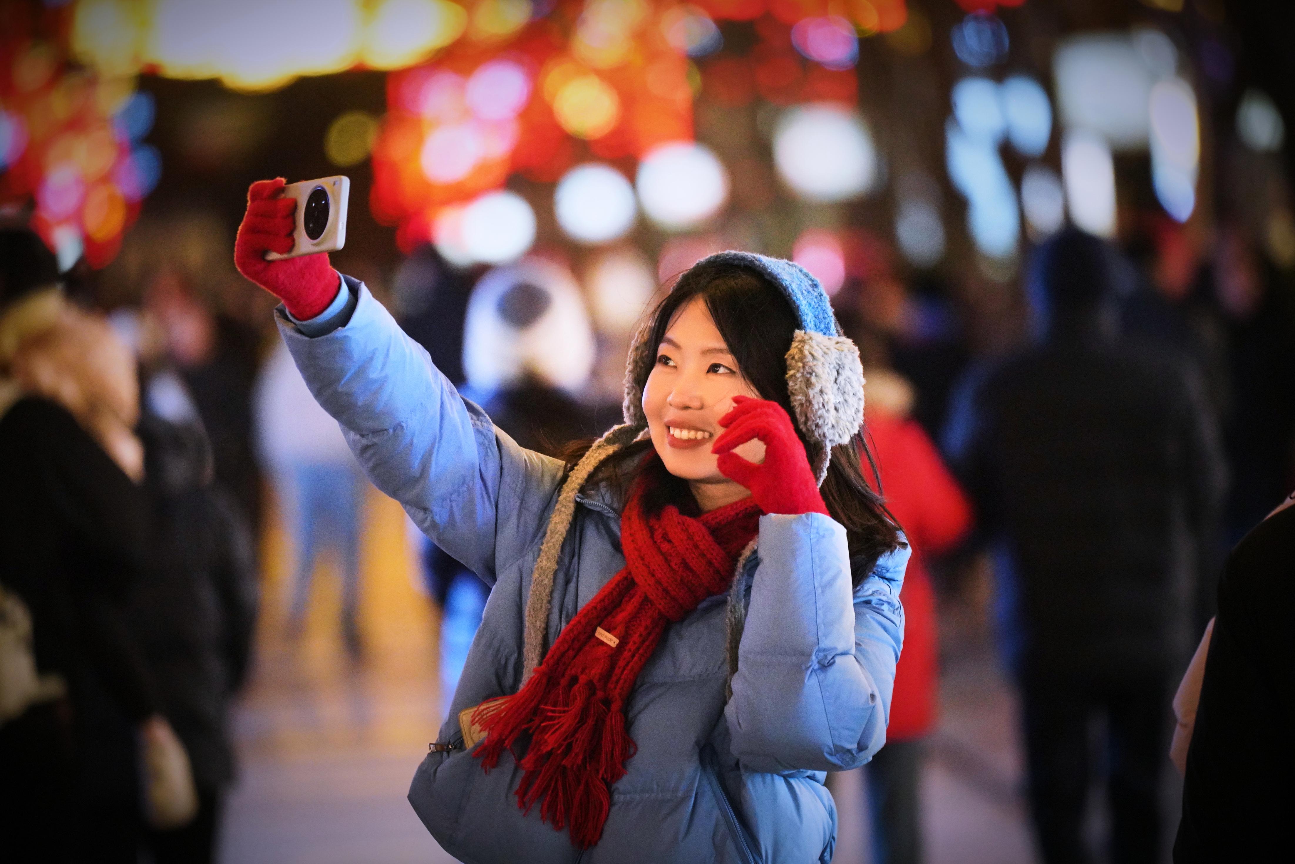 街上人潮熙攘,商铺橱窗灯火温软,游客的笑脸被彩灯映得明媚。街边巨型的毛绒福字喜气洋洋,橱窗里的“北京”字样醒目亮眼,无需刻意取景,随手一拍,便是年味氤氲的大片。