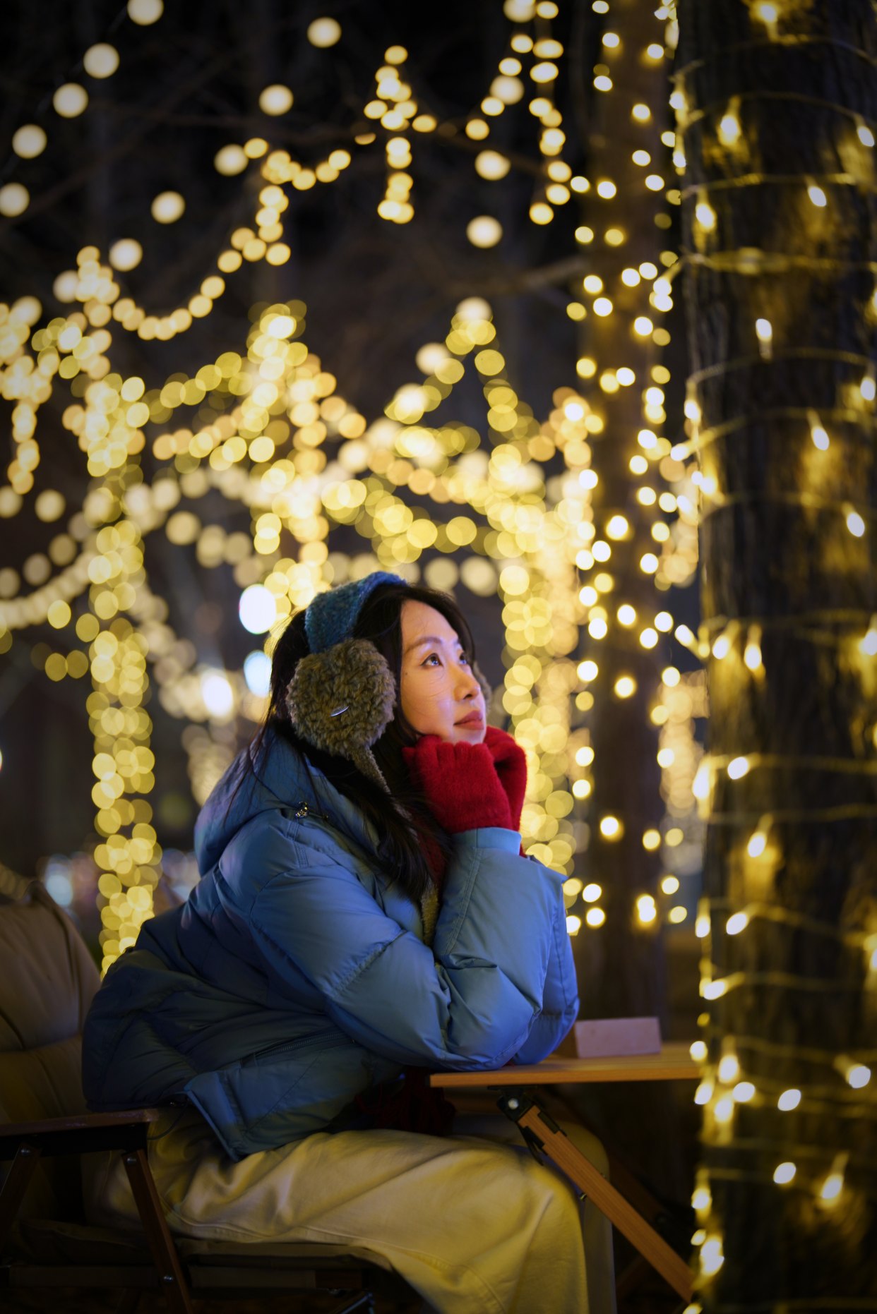 广场林间,灯串如藤缠绕,星星点点洒落肩头发梢,将氛围感拉满。