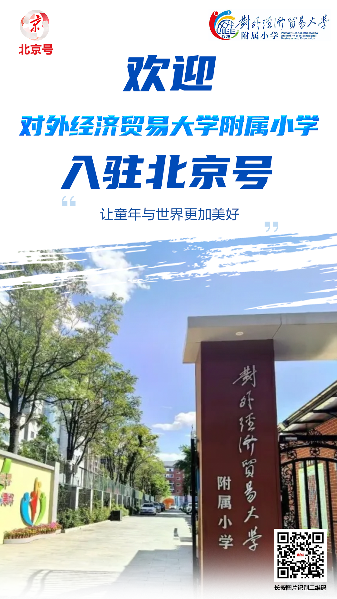 对外经济贸易大学附属小学建校于1936年,2015年正式更名为现校名,为朝阳区素质教育示范校。作为对外经济贸易大学的附属小学,该校向着“惠心 慧行 会学 汇创”的八字校训砥砺前行。从对外经济贸易大学办学理念、自身发展等方面寻找学校文化的基因,遵循实施“惠+教育”的办学理念,树立“守正 仁爱 博识 悦创”的教风和“明理 正行 志学 日新”的学风。