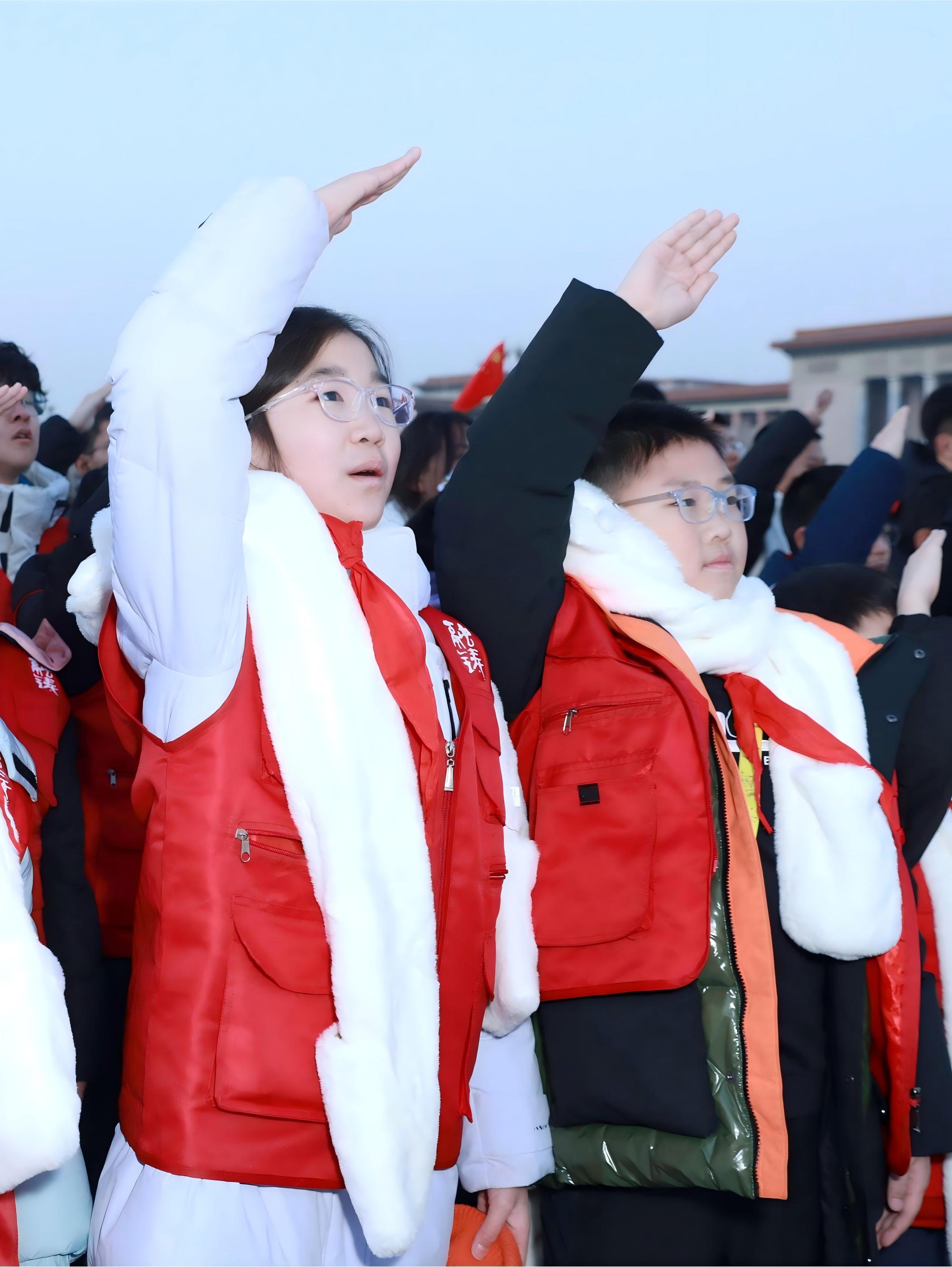 天还没亮,两地师生早早齐聚天安门广场,只为赴一场与国旗的庄严约定。当朝阳冲破天际,雄壮的国歌声响彻广场,五星红旗冉冉升起、迎风飘扬,两地学子身姿挺拔、目光坚定。行注目礼、唱国歌,每位学生的眼里都饱含对祖国的热爱,每一句歌声都流露出民族的自豪。这堂“露天思政课”,让爱国情怀在晨光中散发出更耀眼的光芒,让“民族一家亲”在严冬中更增添了几分暖意。