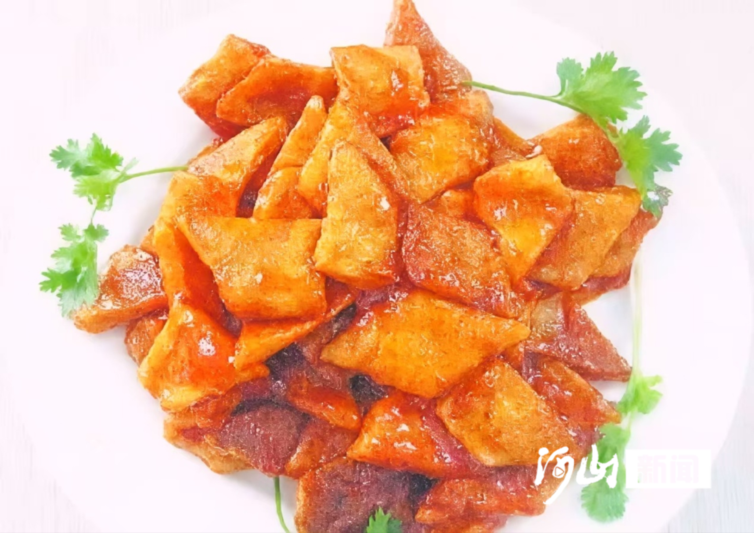 这饹馇的身世,还有更风光的说法。相传1900年,慈禧太后西逃路过万全,当地乡绅霍枚奉上一道韭菜炒饹馇。太后尝了两口,觉得顺滑香甜,甚是可口。按规矩,一道菜她最多动两筷子就要撤下,可这回她还没吃够,便说了声“搁着吧”。太监以为赐了菜名,忙传“老佛爷赐名‘搁着’!”“搁着”与“饹馇”谐音,这道小吃从此便身价倍增,名扬四方了。一张薄薄的饹馇,可荤炒,可素拌,还能拔丝、油炸,豆香浓烈,去火败毒,是万全人餐桌上百变的家常美味。