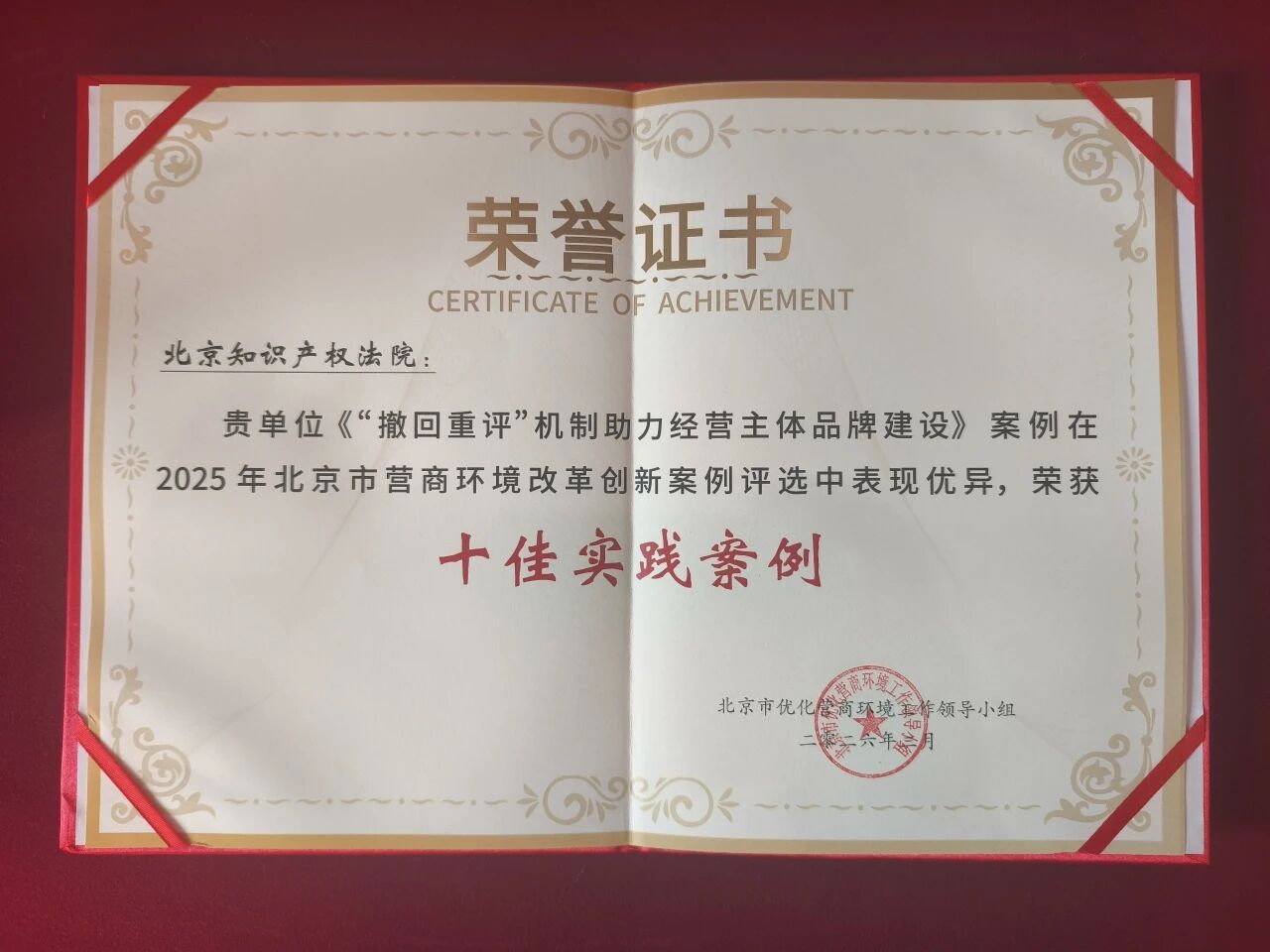 2月4日,北京市发展和改革委员会召开“北京优化营商环境年度大会”,公布2025年北京市营商环境改革创新案例评选结果,对获奖案例予以表彰推广。北京知识产权法院报送的“‘撤回重评’机制助力市场主体品牌建设”案例从全市60个候选案例中脱颖而出,成功获评“十佳实践案例”。