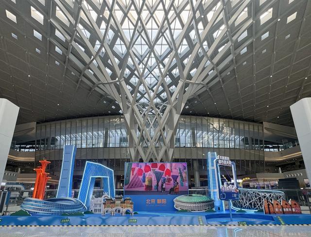 作为系列展览的核心亮点,朝阳区文旅局承办了两大特色展览,共同为旅客呈现多元文化体验。其中,“朝阳·遇见多彩生活”主题展览在枢纽大厅打造了集观赏性、互动性与传播性于一体的文化空间,围绕“文化、艺术、时尚、生态”四大核心,结合枢纽通行属性,创新采用“静态展示+数字互动+打卡传播”模式,实现文化与枢纽功能深度融合。现场主题展板错落有致,电子触摸屏、LED屏幕同步联动,循环播放朝阳形象宣传片,大年初一更实时呈现东岳庙民俗活动,让旅客候车间隙便能感受朝阳活力;主题打卡墙搭配特色灯光与背景音乐,兼顾通行效率与观赏体验,成为热门地标;五大展区各有侧重,全方位塑造“双奥朝阳、时尚朝阳、文艺朝阳”城市形象。