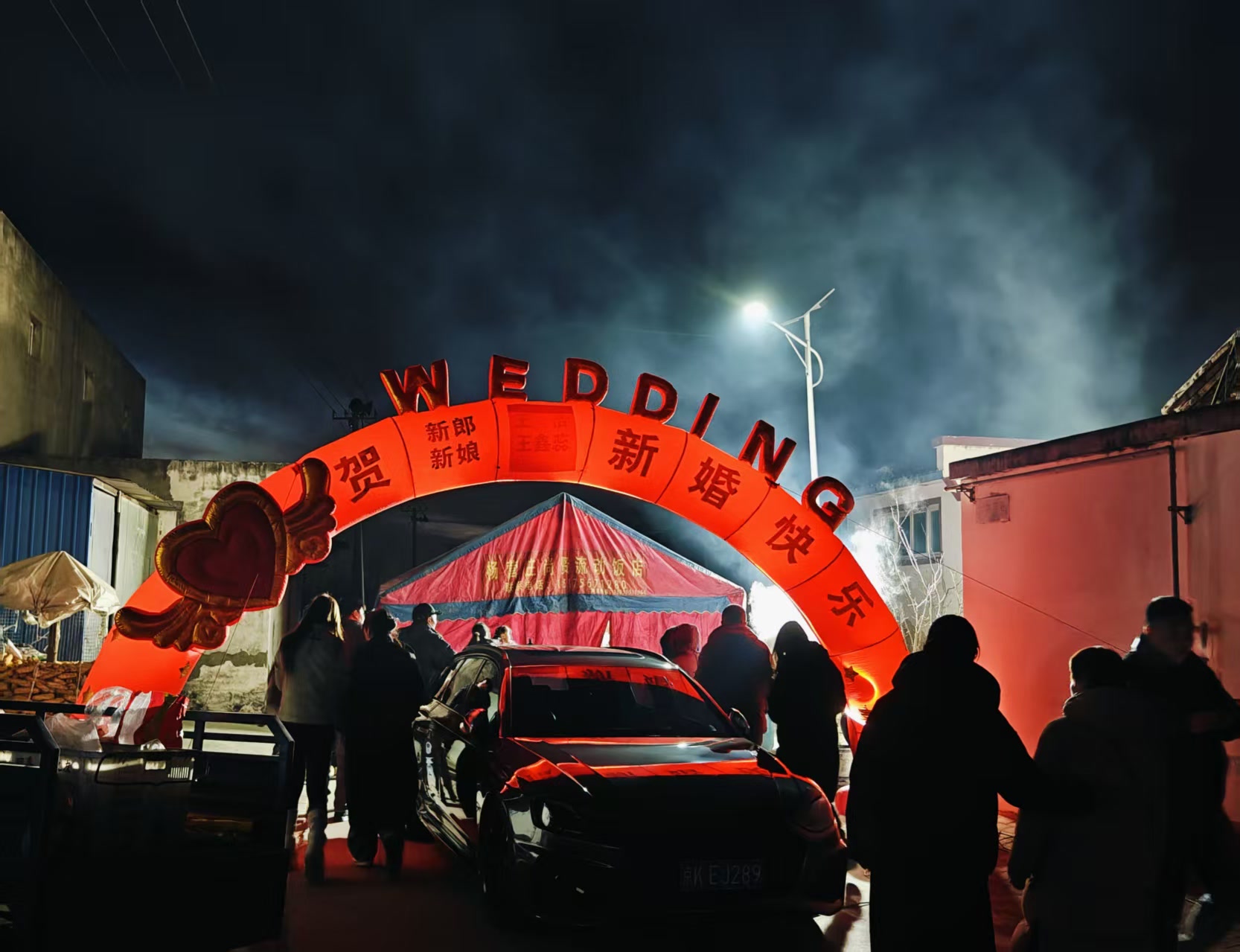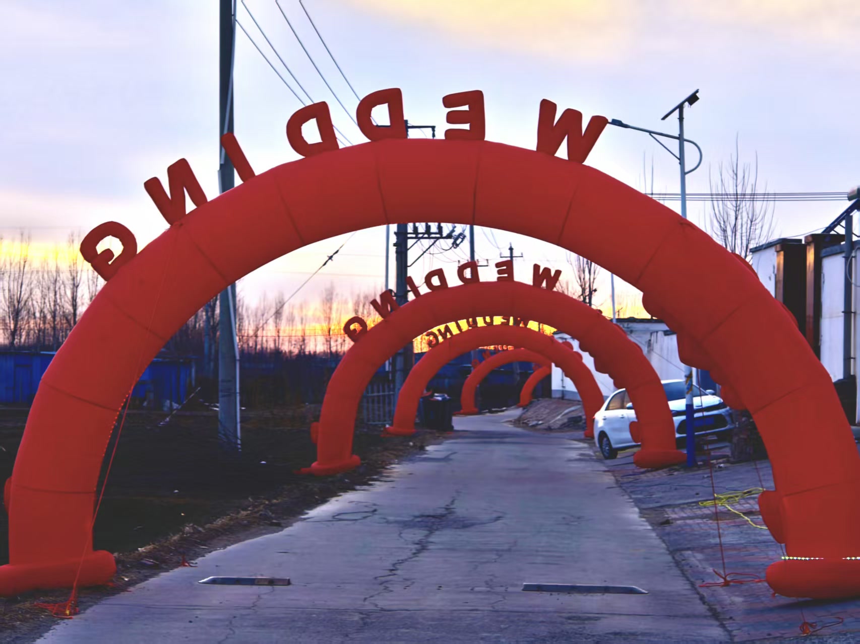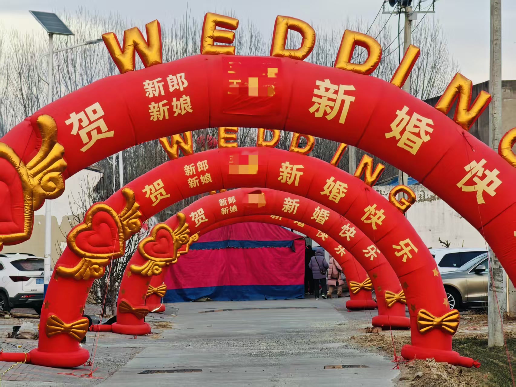 京郊农村办喜事的特色大席,热热闹闹的烟火气,别有一番特色。路西头到路东头,沿路摆满红金配色的充气拱门,逐渐延伸到喜棚。金色的“WEDDING”字样和“新婚快乐”的祝福直白又热烈,把乡里乡亲最朴素的祝福都摆在了明面上。宾客从进村开始就沉浸在新婚的喜悦氛围里,一下子就把婚礼那种“全村同庆”的热闹劲儿给烘托出来了。