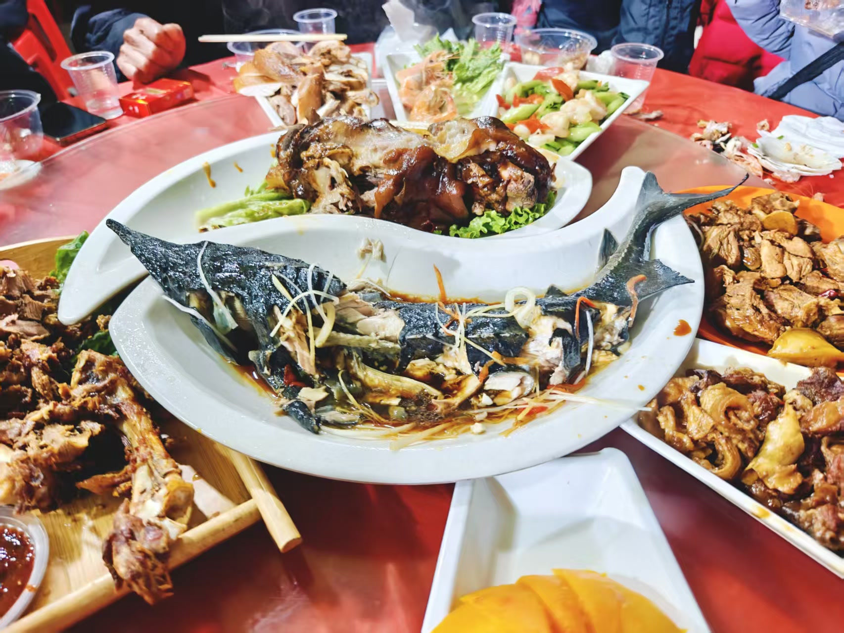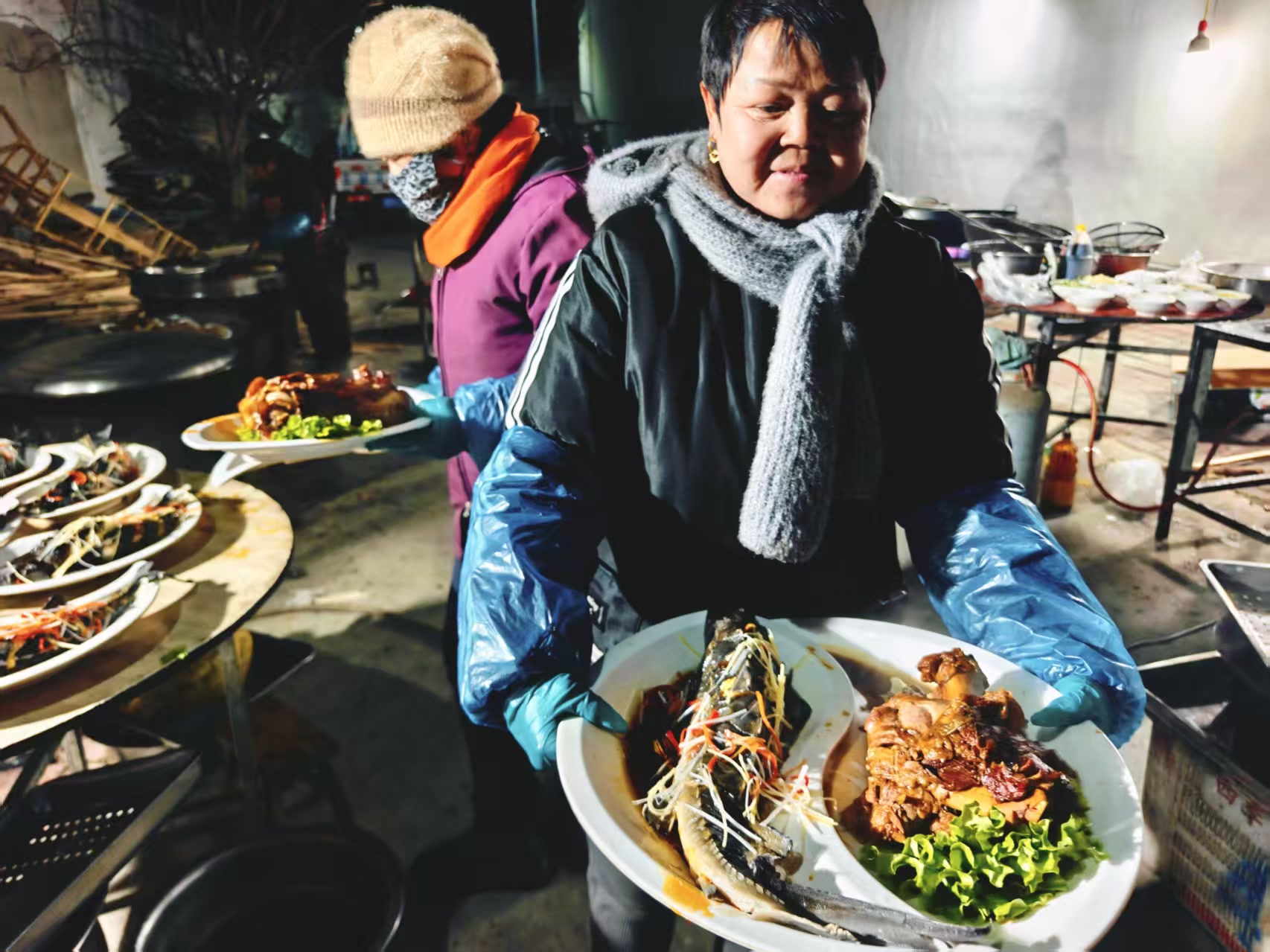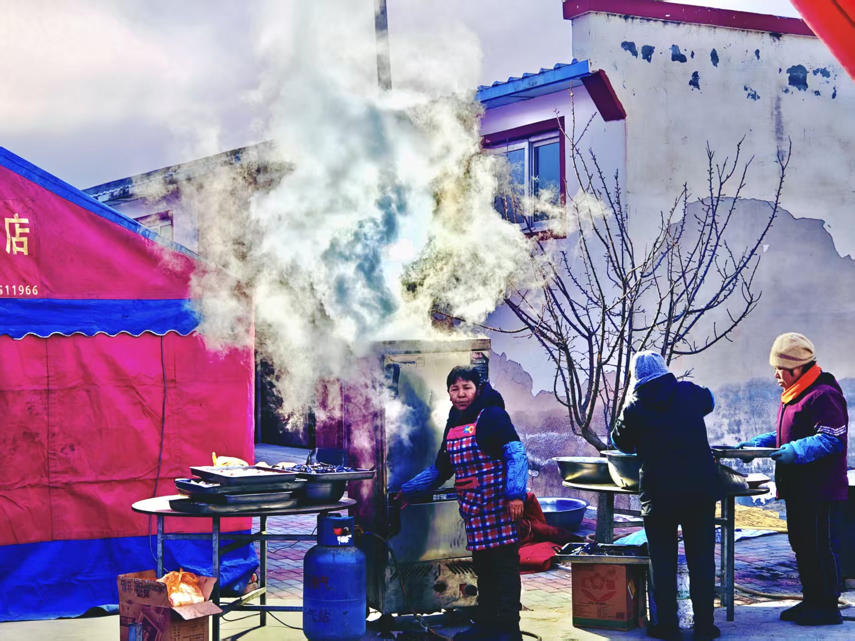 天一擦黑儿,后厨就开始忙活起来,十几桌的量也够大师傅们忙的。没有星级厨房,寒风里支起灶,烟火气里办喜事,一口锅、一把火,照样炖出全村人的欢喜。