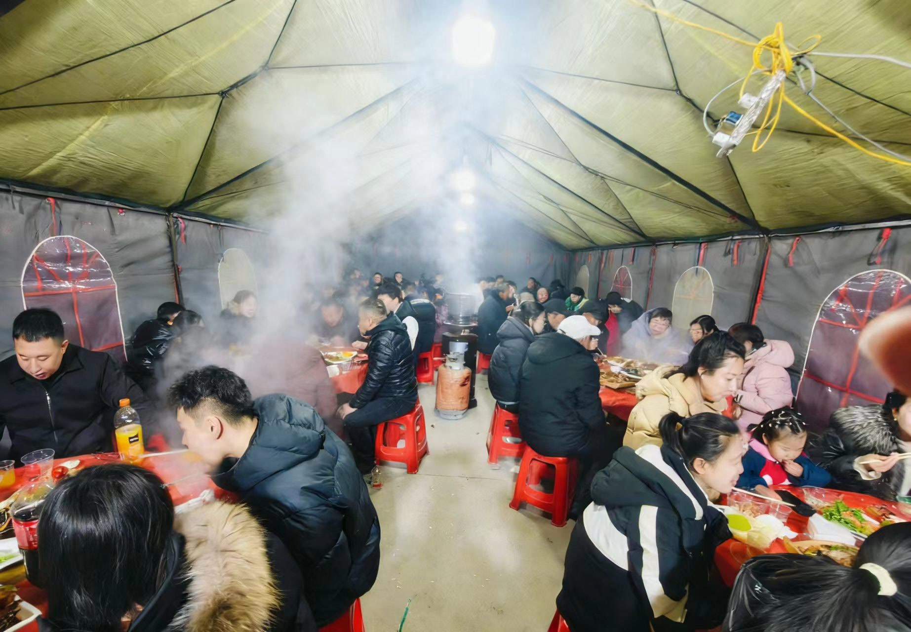 大席开始,客人们陆续来到喜棚,围坐开搓,热气混着笑语在棚顶盘旋,红漆木桌旁坐满了乡里乡亲。