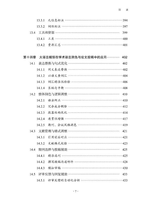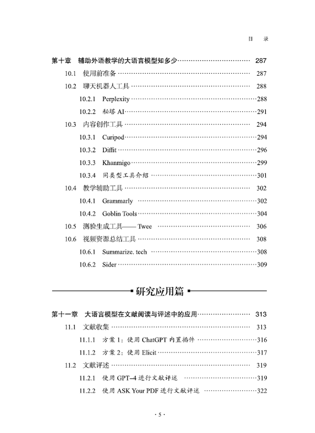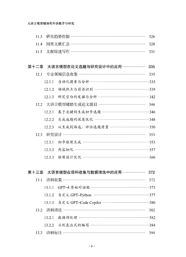 研究应用篇(第十一章至第十五章)则聚焦于大语言模型在外语学术研究中的应用。从文献阅读与评述、论文选题与研究设计,到语料收集与数据清洗、数据可视化分析,再到学术语言润色与论文投稿,大语言模型为科研人员提供了全方位、多层次的支持。本书在11.1小节中介绍了如何利用GPT插件(如Consensus)提高文献检索的准确性,以及如何使用Ask Your PDF等工具辅助研究者进行文献阅读和分析以提高文献阅读效率和精准度。在12.1小节中,研究者可以充分利用大语言模型的强大资料搜索和信息整理能力,持续优化提问,以便更有效地获取研究方向密切相关的文献和数据,找到符合预期且具有较高学术价值的资料。这种互动过程可以提升信息搜集的效率,并使研究者能够了解最新的学术发展趋势。对于非计算机背景的研究者,编程常是一大难题。本书在第13章和第15章中展示了大语言模型如何辅助研究者编写代码,简化编程过程。通过数据抓取、正则表达式编写、词性标注及数据可视化等实例展示了大语言模型在编程方面的出色能力,为研究者提供了高效的技术路径,使编程成为科研探索中的有力工具。