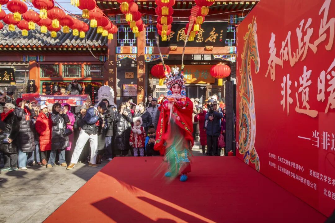 启动仪式于10点在中国书店(琉璃厂店)门前小广场准时开始,锣鼓点清脆、皮黄声响起,开场舞蹈《万马奔腾》气势如虹,一段原创京剧《龙马献福》让在场戏迷大呼过瘾,多个原创节目通过不同的形式,充分展示了马年元素,更让非遗技艺在热闹氛围中焕发出新活力。此外,张一元的“马上暖心茶”,带来别样的参与感和阵阵暖意。